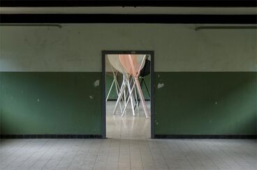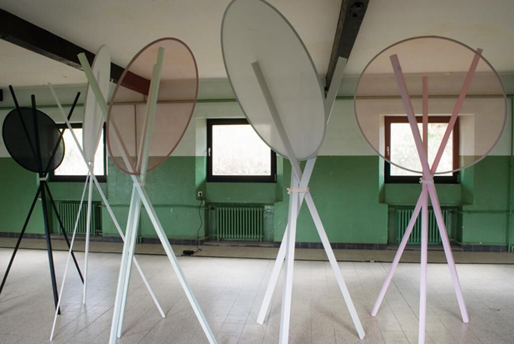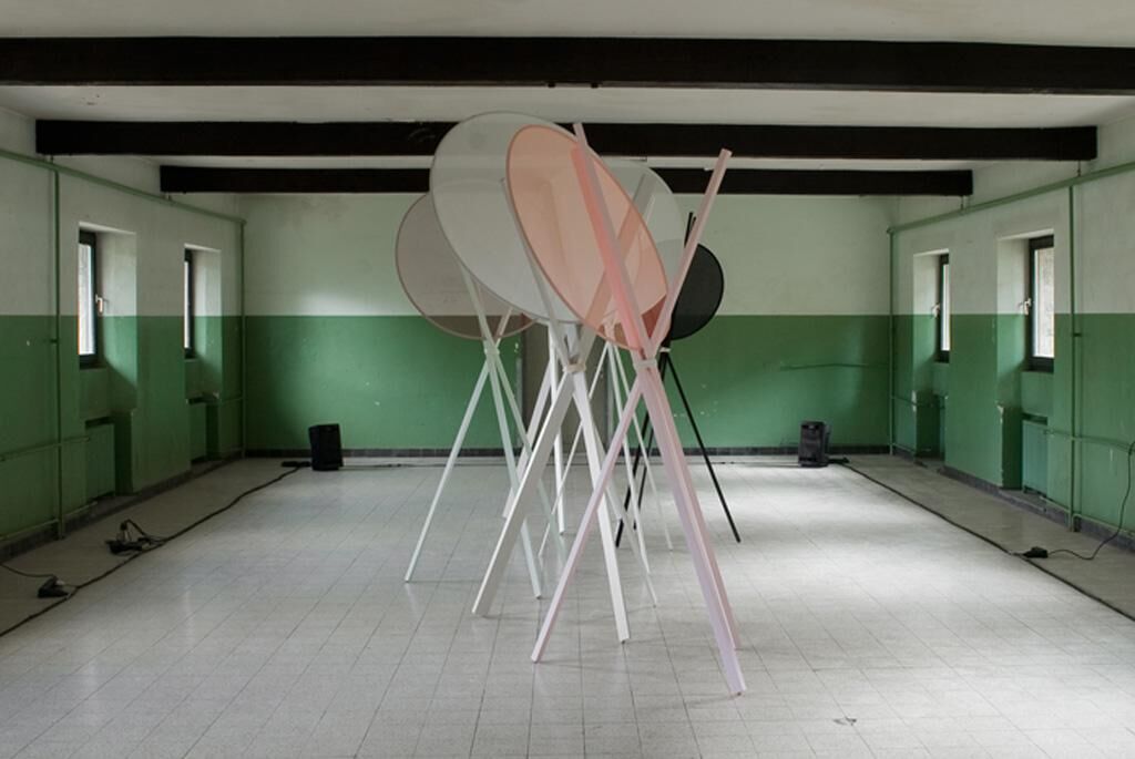 Installation im Kameradschaftshaus der ehemaligen NS-Ordensburg Vogelsang, Eifel, Nordrhein-Westfalen im Rahmen der Vogelsang-Intervention (16. bis 18. Oktober 2009). Die Installation setzt sich aus mehreren Skulpturen und einem Audiotrack zusammen. Die Skulpturen bestehen aus lackierten Holzlatten unterschiedlicher Stärke, die jeweils eine einfache Dreibeinkonstruktion bilden und auf denen sich mit Stoff bespannte Kreisformen befinden. Über die aufgestellten Lautsprecher ist der nachbearbeitete Klang einer Harfe zu hören (mitproduziert von Beatrice Martini). Die ortsbezogene Installation geht auf den geschichtlichen Hintergrund des Kameradschaftshauses ein, das sowohl in der NS-Zeit als auch in dem Zeitraum der belgischen Nutzung als Schlafraum für männliche Junker und später für Soldaten genutzt wurde. Neben dessen grundsätzlicher Funktion als Unterbringung lässt sich anhand seiner architektonischen Merkmale ein weiteres ideologisches Ziel erkennen, nämlich die Komprimierung von Menschen auf engen Raum, um so das kollektive Bewusstsein zu stärken und die Selbstwahrnehmung als Individuum einzuschränken. Es ist heute immer noch deutlich spürbar, dass dieses Gebäude eine bestimmte Ordnung der Kontrolle und Einschränkung verkörpert. Der Schlaf, früher ein alltäglicher Ablauf im Kameradschaftshaus, ist ein individueller Prozess, verantwortlich für die Persönlichkeitsbildung junger Menschen. Er bildet einen Gegenpol zur Ideologie dieses Raumes und entzieht sich seiner Kontrolle, da er ein losgelöster freier Prozess ist. Die Harfe, eines der ältesten Instrumente weltweit, ist ein spirituelles Instrument. Ihr Ursprung ist auf den steinzeitlichen Jagdbogen zurückzuführen, der in einer weiterentwickelten Form als Musikbogen Jägern zur Aufführung ritueller Tänze diente. Der harmonische Klang der Harfe wird in der Installation dekonstruiert und in zeitlich versetzte Abschnitte aufgeteilt. Die Skulpturen schaffen durch ihre fragilen Konstruktionen einen Gegensatz zur monumentalen Architektur des Raumes.