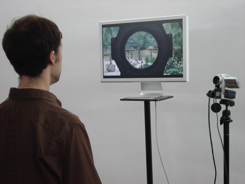 Im First-Person-Shooter, einer Genreart aus dem Bereich der Computerspiele, ist die Geste des Schießens durch das Umlegen des Abzuges auf den Mouseknopf völlig abstrahiert. Es existiert keine haptische Verbindung zwischen der Tat und der Reaktion im Computerspiel. Diese extreme Geste wird so zu einem Reaktions- und Geschicklichkeitstest, die Konsequenzen der Betätigung des Abzuges werden ausgelagert. Die Arbeit koppelt dabei den Mausclick an den Abzug einer Paintball-Pistole, womit bei jeder Betätigung der Taste ein Schuß abgegeben wird.