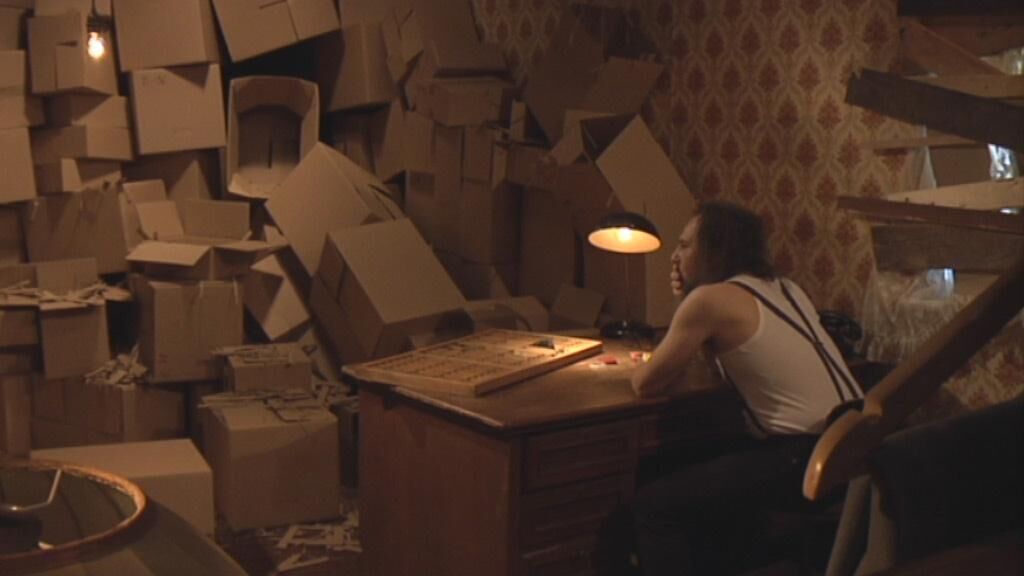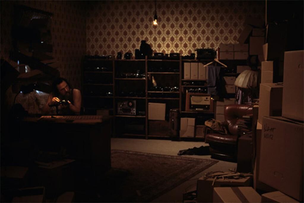 In der fotografischen Inszenierung „Still” (Bild 1) setze ich einen einsamen, irren Sisyphos an einen riesigen Schreibtisch und lasse ihn analoge Kameras reparieren. Sein Fenster ist von innen zugenagelt. Er wird beobachtet, macht nicht ein einziges Bild. Analog dazu gibt es eine filmische Inszenierung „Sisyphos” (Bild 2 und 3), die auf andere Art diesen Teufelskreis beschreibt. Das Foto wie der Film sind als eigenständig funktionierende Werke angelegt. Die fotografische Arbeit wird als Reihe von Dias (Duplikate mit unterschiedlicher Belichtungszeit) direkt an die Wand projiziert. Das Bild ist zunächst dunkel (unterbelichtet), wird immer heller (überbelichtet), bis es verschwindet, taucht dann langsam wieder auf. Dies geschieht im Loop mit insgesamt 80 Dias. Das Geräusch des Projektors spielt dabei ebenso eine Rolle. Mit der Erinnerung des Betrachters verknüpft, wird nach dem Klicken ein anderes Bild erwartet. Das Einzige, was jedoch passiert, ist eine Änderung der Lichtverhältnisse. Genau wie die Person im Bild steckt der Betrachter fest.