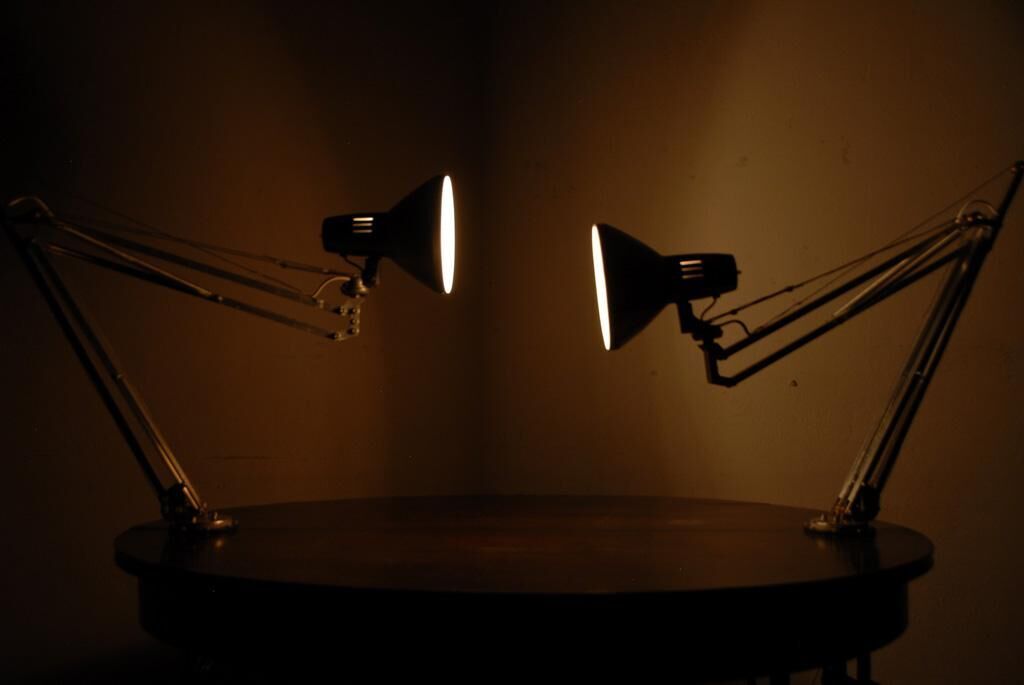 ""Monolog Of Two Machines"" ist eine kinetische Installation aus zwei Lampen im Lichtdialog. Über Seilzüge werden die beiden Federarme in Bewegung versetzt und entwickeln somit eine Form der Gestik. Sobald sich ein Betrachter annähert, schrecken die Lampen aus ihrem Gespräch auf und fokussieren den Eindringling, bis wieder eine Mindestdistanz besteht. Die assoziative Verknüpfung der mechanischen Dynamik mit dem eigenen Gestikrepertoire vermittelt die Kontur von Leben und ermöglicht dem Betrachter eine Dekodierung der Bewegung nach menschlicher Lesart.