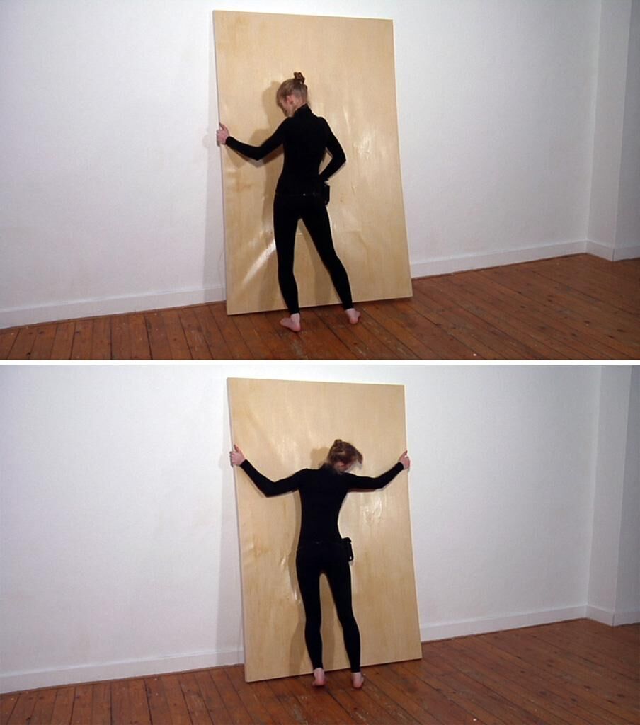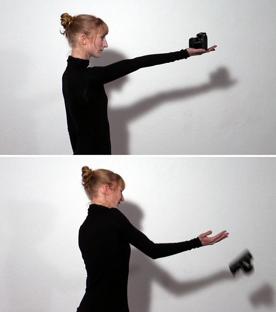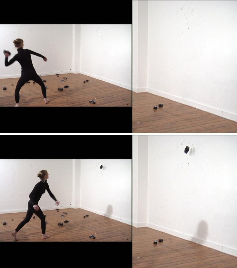 In „Fuck” (Bild 1) lasse ich einen analogen Fotoapparat gegen und mit einer Leinwand „antreten”. Die Kamera dient mir dabei als Körperverlängerung und Waffe. Während ich versuche die Leinwand zu penetrieren, entstehen Risse und Ausbeulungen. Mit umgeschnallter Kamera stoße und kratze ich die Leinwand, hinterlasse dabei Spuren der Aktion. Die Apparatur bearbeitet so einen inkompatiblen, fertig grundierten Bildträger. Die Performance erinnert an einen Liebesakt. Gleichzeitig hört der Betrachter zufällig entstehende Trommelgeräusche, Knacken, Reißen der Leinwandstruktur oder ein Klicken der Kamera. „Spiel mir das Lied vom” (Bild 2) ist eine Performance, durchgeführt mit 25 analogen Kameras und einer Wand als Zielscheibe. Die Kameras werden in einer „Wurfübung” gegen die Wand geschleudert und damit lädiert oder zerstört. Sie fallen zu Boden und hinterlassen kleine Dellen und Spuren der Kameraoberflächen an der Wand. „Sein” (Bild 3) beschränkt den Aktionsraum auf eine Kamera und mich. Ich lege mir diese selbst auf die ausgestreckte rechte Hand, auf Augenhöhe. Das Objektiv sieht mich an. Ich sehe das Objektiv oder die Kamera an. Mit maximaler Anspannung meiner Armmuskulatur steuere ich dem Gewicht der Kamera entgegen. Die Anstrengung wird dabei immer größer, bis am Ende die Kamera dieses Armdrücken „gewinnt” und zu Boden fällt.