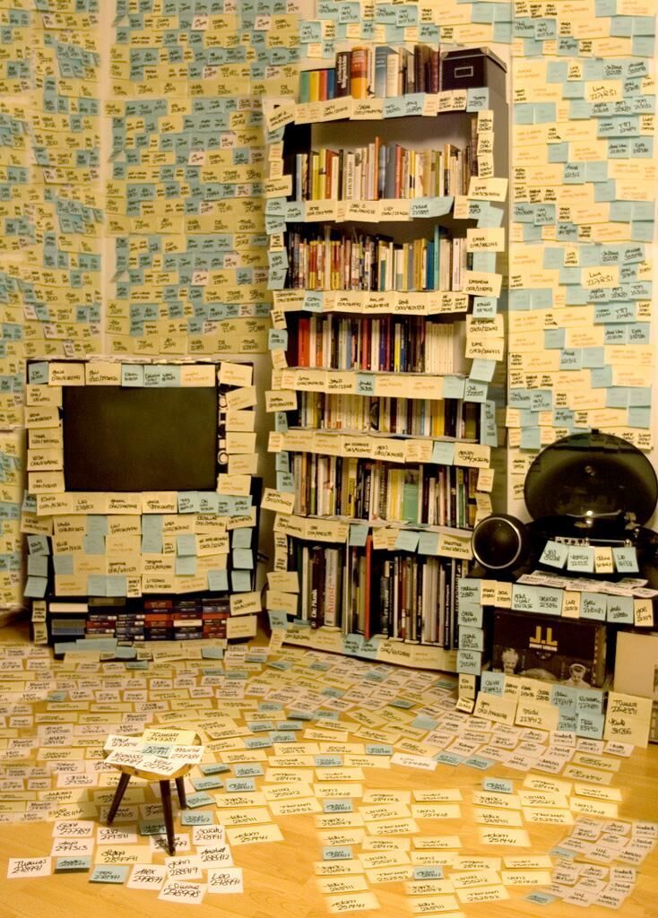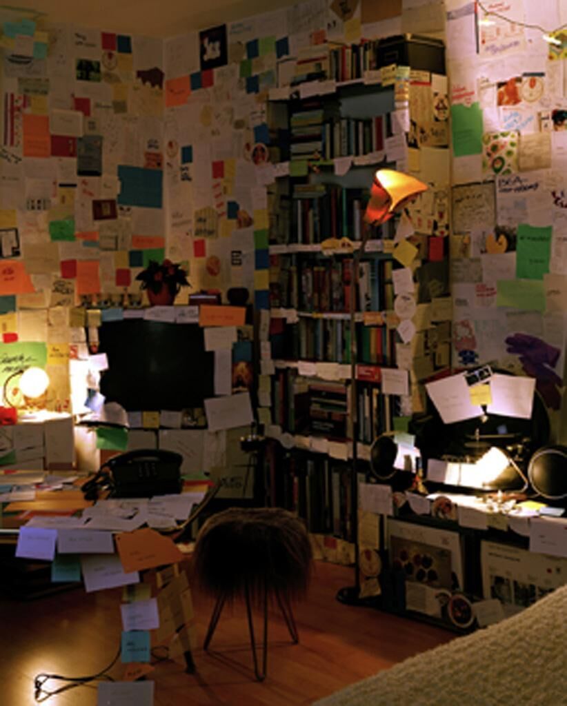 Fotografie eines inszenierten, fiktionalen Raumes, der von oben bis unten überfüllt ist mit unterschiedlichen Zetteln, auf denen sich jeweils ein Name und eine Telefonnummer von real existierenden Personen befinden. Dieser Raum stellt ein tatsächliches Kommunikationsnetzwerk in der Problematik der heute (fast schon) überflüssigen Zettel und der digitalen Netzwerkkommunikation dar.