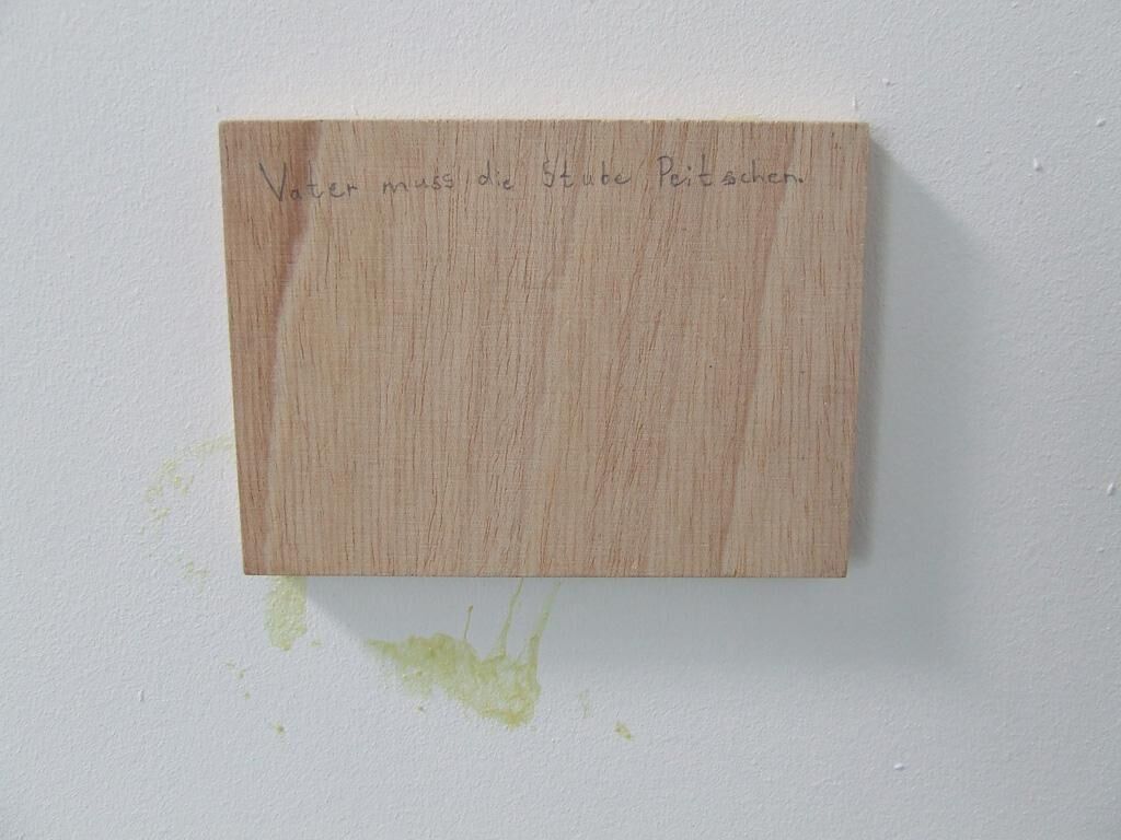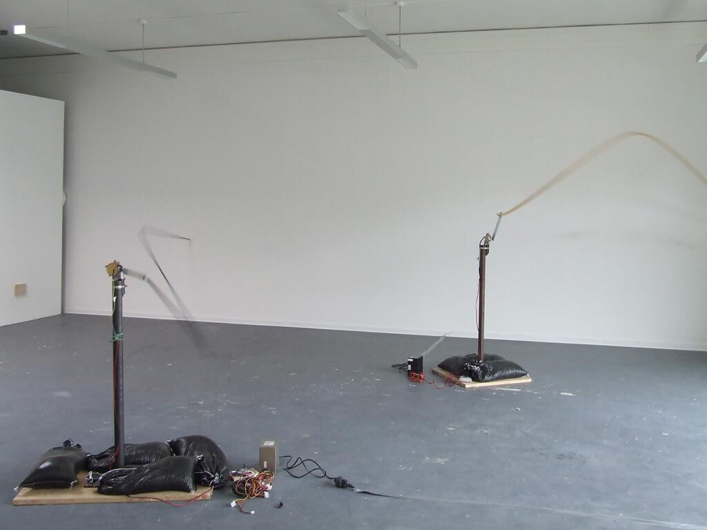 Drei Seile peitschen den Boden und die Wand. Wesenhaft. Erinnerung an das Kinderspiel. Abgrenzung und Absperrung. . . werden in Bewegung gesetzt. Lauter Knall und Hall im Raum vereinen sich. Gedämpfter Boden schwächt den Knall. Eine dünne Stimme. Wiederholung, Loopkraft, die gleiche Bewegung, unterschiedliche Bilder und Assoziationen. Variationen und Wiederholung. Erinnerung und ein Schlag. Ein Motor, eine Wand und ein Seil. Alles erscheint gleich und doch anders. Der Kontext. Wo auch sie erlöst, aber keinesfalls enderlöst werden, sie bringen nicht viel Erlös, aber erlöst wollen sie werden, der eine will diese Erlösung, der andere eine andere. Gallertartige Fäden. Höhe, Weite und Tiefe überwinden. Der Weg bahnt sich, bevor er weg ist. Frau Dr. Schnittzler: „JAUCHE!JAUCHE!JAUCHE!! Wandel Sie, oder friß ein Tier!“ Alle kommen in die Jahre und sind auf den Gedanken gekommen: Wanderer wandere Die Wände Da ist und hat man dann umsonst gefallen.