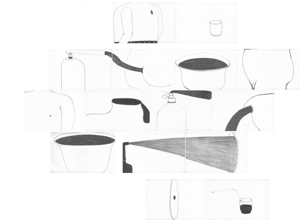 In der Unbeweglichkeit der Objekte zeigt sich ihre Passivität gegenüber den am Körper vollzogenen Handlungen, welche vordergründig zur Reinigung und Heilung dienen, zugleich aber ein Instrument der Machtausübung sind. Ziel ist eine “Um-Erziehung”, d.h. den Menschen so zu verändern, dass er bestimmten Kriterien entspricht. Diese Passivität ist das Ergebnis einer durch die Erziehung subtil verordneten Hörigkeit. Die strengen Schwarztöne, welche die Bildkompositionen dominieren, stehen im Kontrast zu der zarten, aber kontrollierten Art der Linienführung.