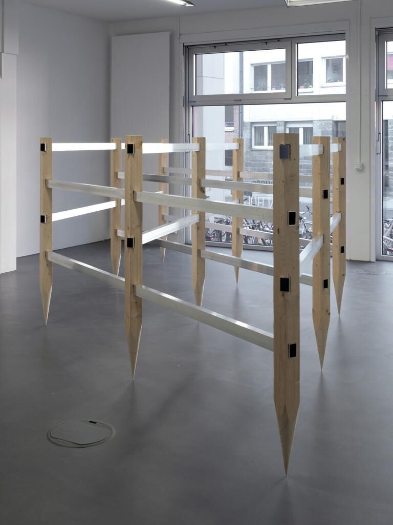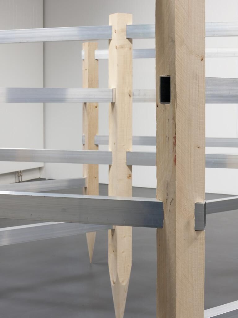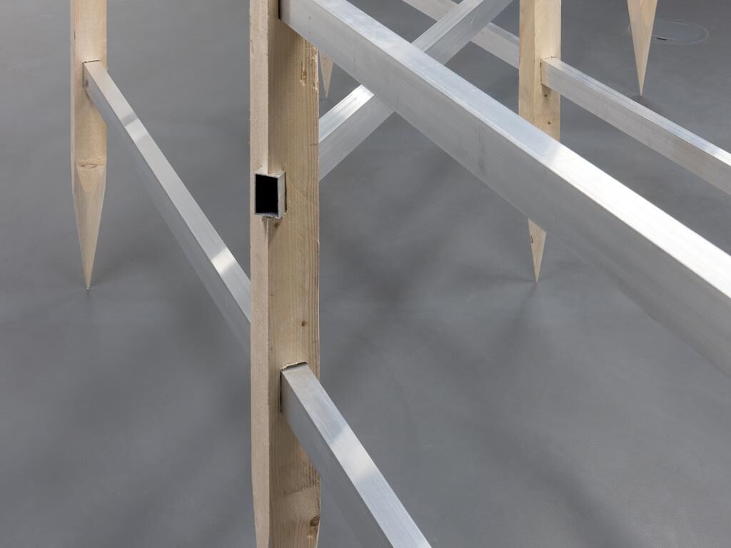 Die Skulptur dominiert den Ausstellungsraum und berührt den Boden nur an wenigen Punkten. So wie die archaische schraubenlose Befestigungstechnik der Balken und des Aluminiums wirken die Spitzen auf dem Boden unangenehm und dennoch leicht.