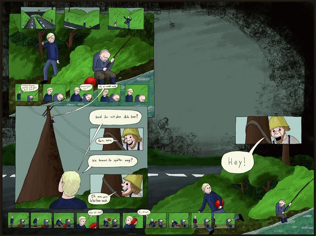 [aɪ] ist ein Comic, das in drei Tableaus die Geschichte einer surrealen Irrfahrt eines Trampers erzählt. Die Tableaus werden in Leuchtkästen präsentiert, die in nicht eindeutig narrativ-linearer Lage an den Wänden hängen. Es ist für den Betrachter nicht klar, wo er die Geschichte zu lesen beginnen soll. [aɪ] wird an einem Unort ausgestellt, also in einem Belüftungs- oder Kellerraum, einem Treppenhaus oder einem schwer zugänglichem Hinterhof. Es ist dunkel, so dass das Comic in den Leuchtkästen die einzige Lichtquelle ist und – hier dem Medium Kino näher als dem Printmedium Comicbuch – den Raum in die Farbe der Geschichte taucht. Das Comic wird untermalt mit einer Klanginstallation, die dem Unort entspricht. Die Musik ist immer dezent und atmosphärisch, so dass sie dramaturgisch jeden Part der Geschichte untermalen könnte. Es ist unklar, ob hier eine komplett fantastische oder eine nur leicht gebrochene, reale Geschichte erzählt wird. Die Umstände der Präsentation des Comics lassen das mysteriöse Gefühl aus der Geschichte in die Realität schwappen.