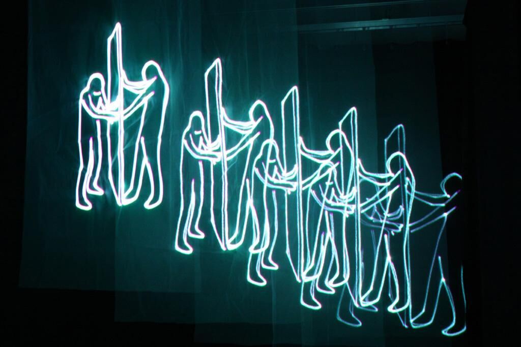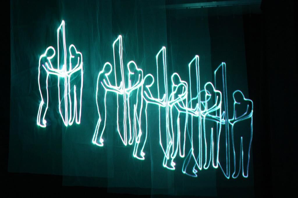 Diese Arbeit ist eine Animation im Loop, in der zwei Menschen versuchen gleichzeitig eine Tür zu öffnen. Die Animation wird mit dem Laserscanner auf drei verschiedene Stoff-Flächen hintereinander projiziert. Daher entsteht das gleiche Bild in verschiedenen Größen auf jeder Fläche. Die Animation bekommt dadurch ein physikalisches Dasein. Die Idee von Einsperrung, Ungeduld und Abtrennung entsteht.
