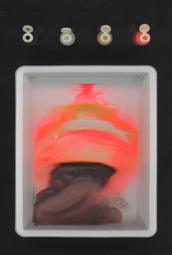 Der Scanvorgang als Prozess im Bild: Obwohl wir ein »Bild« als Endresultat sehen, ist es eine Aufzeichnung seines Entstehungsprozesses! Das Bild zeigt die Chronologie einer Dauer, die auch in ihrer bildlichen Reproduktion chronologisch korrekt ist. Somit kann Zeile für Zeile nachgelesen werden, wie Farben im Wasser diffundieren und sich ausdehnen. Die Diffusion findet aber nicht nur durch die Färbung des Wassers, sondern im unsichtbaren, digitalen Bereich statt. Dies führt zu den spezifischen Artefakten des Scannens.