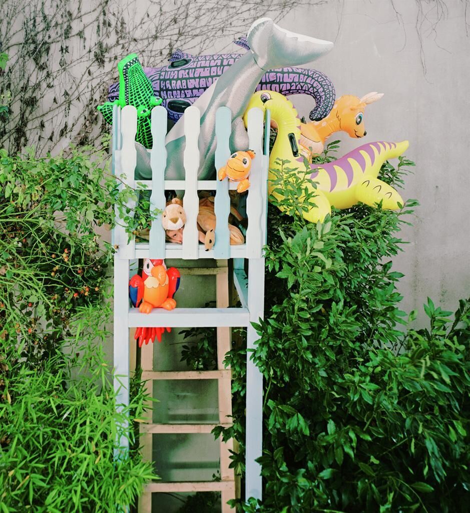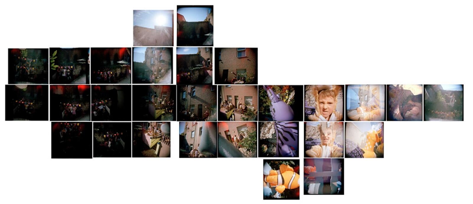 „Snapshots carry little information, They are probable. But some of them are highly informative, difficult to futurize; and for a curious reason: they are bad photos. They owe their information to an error, to a deviation from the camera program. New biological species arise through errors in the transmission of the genetic program. “ (Vilém Flusser) Irgendwo in einem Hinterhof wurden vier Räume geschaffen. Es sind klar begrenzte Balkone. Sie zeigen sich als nachempfundene Umgebungen mit einigen leuchtenden Accessoires. Trotzdem bleiben sie als Stilisierungen städtischer Lebensräume kulissenhaft. In diese Sets brachte die Fotografin Charlotte Krauss Schauspieler und Laiendarsteller. Sie besetzte ihre Schauspieler als Typen. Es gab den Gärtner, „Lovis“, den kleinen Jungen, die Familie, das Liebespaar und die Partybesucher. Sie hatte eine Simultanerzählung im Sinn, stattete ihre Schauspieler mit Kostümen aus. Ihre Rollen durften die Darsteller selbst entwickeln: Der kleine Junge konnte mit den Bergen von Spielzeug machen, was er wollte. Die Partygäste sollten eine Party feiern, mit Partyspielen, wenn sie wollten. Die Familie sollte zu einem Familientreffen zusammen kommen, vielleicht gab es Streit. Das Liebespaar war gerade erst eingezogen, frisch verliebt. Vorab entstanden die großen Tableaus. Die Fotografin machte sich ein Bild von ihrer Inszenierung, dann verließ sie das Set und überließ jeder Gruppe eine Kamera. Vilém Flusser unterscheidet zwischen drei Typen von Fotografien: solche, die mit einer vollautomatisierten Kamera gemacht wurden, die etwa für die Erhebung wissenschaftlicher Information beispielsweise von der Nasa genutzt werden. Außerdem geht er von professionellen Fotografien und von Amateur-Fotografien aus. Er unterscheidet die Geste des Amateurfotografen von der intendierten Haltung des professionellen Fotografen. Der Amateur drückt auf den Auslöser und lässt die Kamera arbeiten. Er achtet nicht auf den perfekten Bildausschnitt, es geht ihm um jeden Augenblick, er knipst, was vor die Linse kommt. Der Profi hat ein Konzept, er kennt die Funktionen seiner Kamera und weiß genau, welches Licht er braucht. Charlotte Krauss spielt für ihre Fotoarbeit mit der Bandbreite der inszenierten Fotografie und nimmt die Amateur-Fotografie darin auf. Der inszenierte Rahmen, das durchgestaltete Setting und die Accessoires beeinflussten die Handlungsweisen der Schauspieler. Sie versuchten einen Habitus zu entwickeln, sich ihrer Gruppe oder Rolle anzupassen. Nachdem die Fotografin das Set verlassen hatte, gestalteten sich die Ereignisse freier und unvorhersehbarer. Das Spiel geriet in eine hybride Lage zwischen Inszenierung und Realität. Es wurde gefeiert, gelacht, beobachtet, gespielt, gestritten und vieles mehr. Die Aufnahmen mit unterschiedlichen Kameras (Handy-Kamera, analoge Mittelformat-Kamera, u.a.) wirken wild und ungezähmt. Teilweise sind sie verwackelt, überbelichtet, kaum eines scheint genauer geplant zu sein. Und doch erzählen die Bilder viel über die Situation, die Blicke, die Rollen, die Menschen – aber sprechen dabei doch die Sprache der jeweiligen Kamera (Format, Lichtstärke, etc.). Flusser ahnte 1986 bereits, dass in Zukunft Bilder auf digitalen Displays in Massen kursieren würden. Heute lassen sich die Überlegungen auf die sich ständig multiplizierenden Schnappschuss-Bilder im Internet übertragen. Dadurch, dass die Fotografin sich die Amateuraufnahmen zum Schluss zurückholt, ordnet und mit ihren Tableaus zusammenbringt, wird der Simulationscharakter ihrer Arbeit sichtbar. Sie bringt die Bilder in eine Ordnung (so könnte es gewesen sein), macht sie simultan (in unterschiedliche Richtungen) lesbar, rückt sie damit quasi in eine filmische Linearität. Text: Julia Sprügel