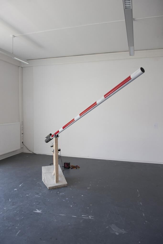 Ein Schrankenbaum durchzeichnet den Raum. Das Öffnen und Schließen wird behandelt als Methode. Das Grenzobjekt ändert seine Aufgabe. So gesehen aufgebäumte Barriere, die wie ein Glied, in eine unnatürliche Stellung gerät. Sture Abgrenzungen und Absperrungen in beständiger Bewegung. Rudernd. Rastlose Wiederholung im Raum gegenüber einem abschüssigem Spielfeld. Erinnerung an ein Glücksspiel. Beschränkt, die kultivierten Gewinnchancen. “Sie können nicht weg, weil sie hier sind.“ / „Sie hätten gut gepasst!“ Weigerer weigere Aufrichten. Aufrichtig! („Weiterrotieren!“)