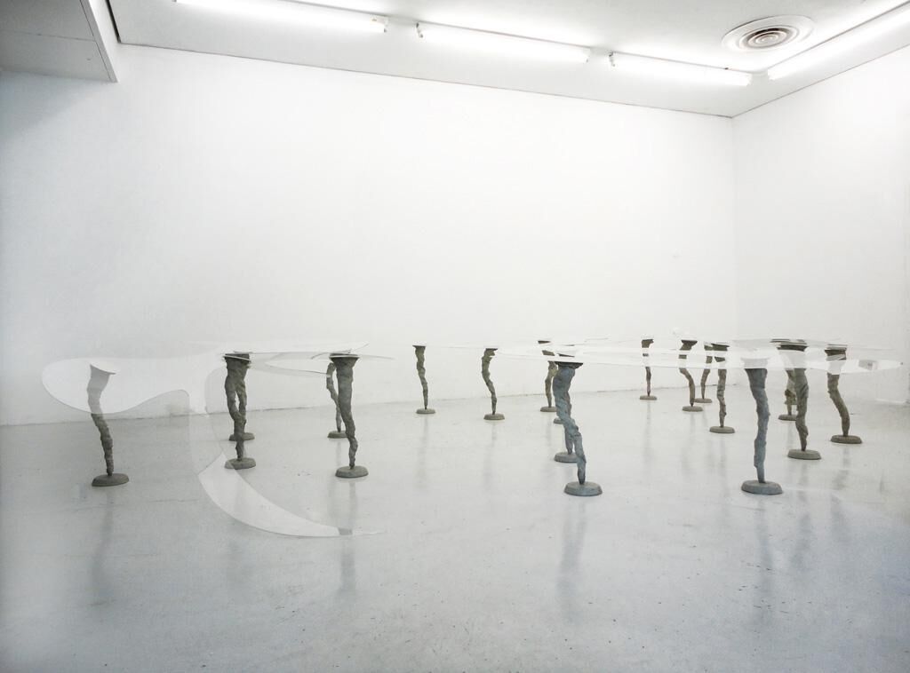 Die mehrteilige Arbeit deutet Zusammenhänge zwischen der „Nierentisch“-Ära der 1950er Jahre und der transformativen Formbildung plötzlich auftretender Wetterphänomene an. Die typisch asymmetrische und freie Formgebung von Architektur und Möbelobjekten der Nachkriegszeit wirkte sich als neues Denken auf sämtliche Konsumgüter aus, ist jedoch mittlerweile selbst zu einem starren Synonym geworden. Dem wird die komplexe Entstehung eines Tornados gegenübergestellt, der in seinem plötzlichen und überwältigenden Auftreten bedrohlich und gleichzeitig ästhetisch beeindruckend ist. Das Wort Tornado bedeutete ursprünglich „umkehren, wenden, drehen“. Die kanonisierte Rezeption von Möbeldesign wird durchbrochen und mit einer zeitlosen, sich entziehenden Volumenbildung konfrontiert.