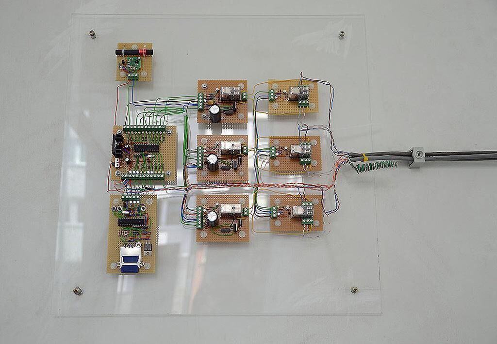 ""Spieluhr an der KHM"" ist eine Maschine, die zu jeder vollen Stunde die automatischen Fenster am Neubau der KHM für drei Minuten animiert. Die Geräusche der Motoren werden mit einem Tonabnehmer abgenommen und zu den Lautsprechern auf dem Dach gegenüber geleitet. Die Maschine besteht aus einer eigengebauten elektronischen Zeitschalung, die an die bestehende Anlage aus drei Kippfenstern mit Kettenbetrieb angeschlossen ist. Auf diese Weise führt die ursprünglich zur Lüftung gebaute Anlage ein Spektakel aus. Die dreiminutige Partitur besteht aus Auf- und Zu-Befehlen, die im Zeitverlauf ein Muster mit sich sinusförmig verändernden Frequenzen bilden. Jede von den drei Partien enthält dasselbe Muster, aber zeitversetzt, sodass die drei Fenster wiederkehrend versetzte und zutreffende Rhythmen spielen. Die eigengebaute Steuerung besteht aus Elektronikplatinen montiert auf einer Plexiglasscheibe. Sie ist als ein Betrachtungsobjekt auf der Wand neben den Fenstern montiert. Die Platinen haben ein nostalgisches Aussehen der Elektronik aus den 70ern - der Zeit, als die Elektronik in der Industrie noch in Handarbeit angefertigt wurde. Die Leuchtdioden visualisieren den Verlauf der Signale in der Schaltung. Das Umschalten der Relais (die automatischen Schalter mit Elektromagneten, die die Richtung der Fensterbewegung umschalten) ist sehbar und hörbar. Die einzelnen Platinen haben folgende Funktionen: Funkuhr, Speicher für die Partitur, Prozessor, drei Umschalter für Motoren, drei Anschluss-Schalter. Die drei letztgenannten Schalter blockieren für die Zeit des Spektakels den Normalbetrieb der Anlage, der durch die manuellen Schalter vorgesehen ist. Die Aufteilung der Funktionen in einzelne Platinen berücksichtigt die Möglichkeit, die Steuerung auch an anderen Orten mit elektromechanischen Anlagen zu installieren, wobei manche Platinen nach Bedarf durch neue ersetzt bzw. erweitert werden können. Die Übertragung der Geräusche zu den draußen installierten Lautsprechern erfolgt über einen Funksender.