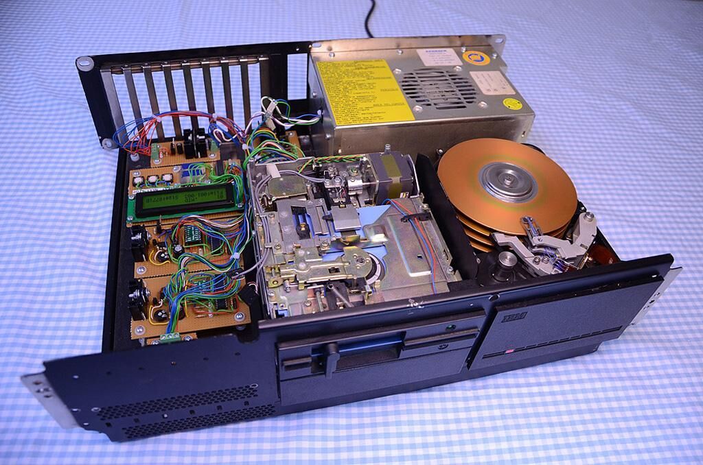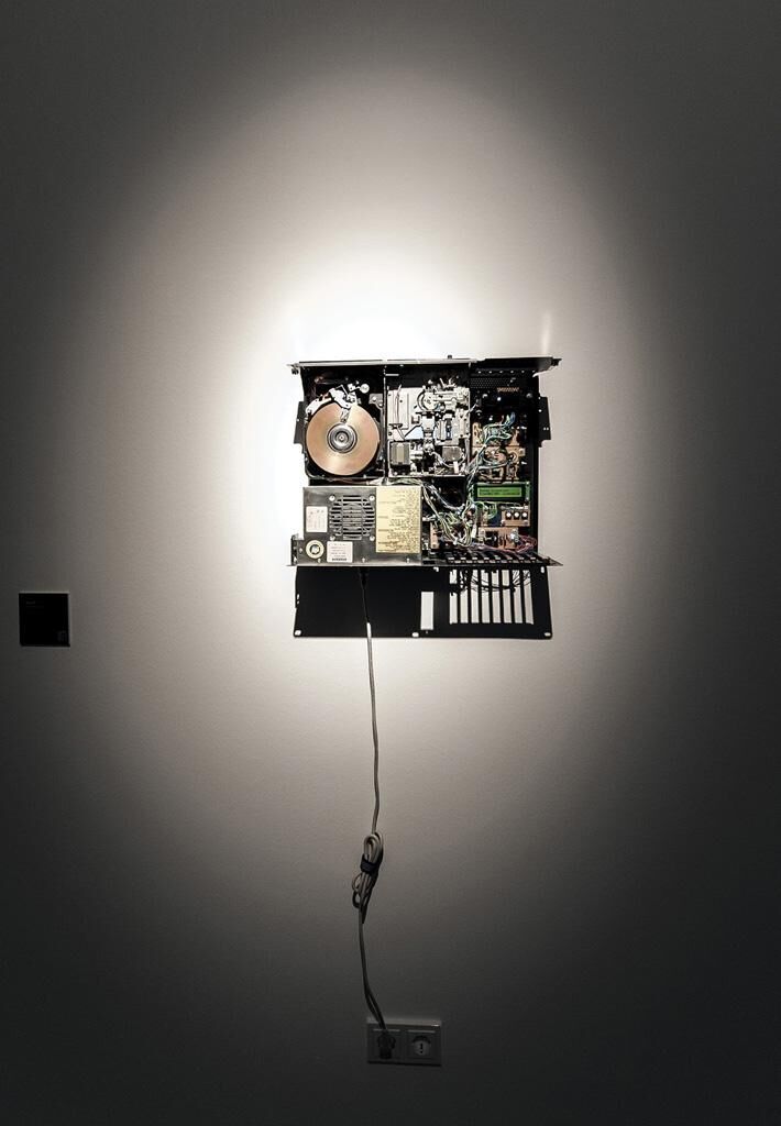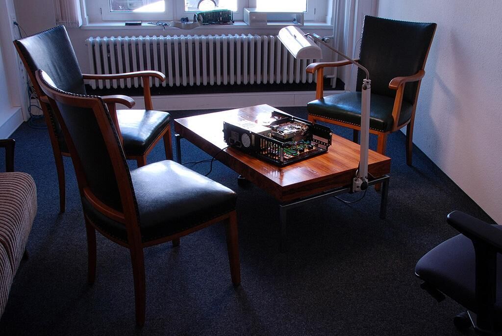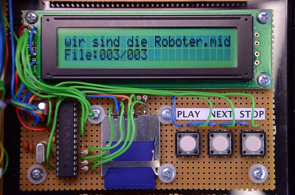 Der Musik-Rechner ist ein IBM PC aus dem Jahr 1986, der zu einer Musikmaschine umgebaut ist. Der Umbau betrifft ausschließlich die Entwicklung einer neuen Elektronik, die die elektro-mechanischen Speicherlaufwerke und den Netzteillüfter so betreibt, dass die dabei entstehenden Töne musikalische Stücke bilden. Die Schreib- und Leseköpfe in der Festplatte und im Diskettenlaufwerk fahren mit den Frequenzen der musikalischen Noten und spielen damit die Melodie. Der Hebel, der im Diskettenlaufwerk den Lesekopf auf die Diskette stellt, spielt das Schlagzeug. Die Festplatte, die Diskette und der Netzteillüfter erzeugen Geräuscheffekte. Das neue Bedienungsinterface besteht aus einem Display mit der Playliste und 3 Tasten: PLAY, NEXT und STOP. Im Repertoire der Maschine sind Musikstücke aus den Kultspielen Pac-Man, Super Mario Bros, Tetris, The Legend of Zelda und Monkey Island. Funktion: Die Elektronik besteht aus einer Abspielplatine und Treiberplatinen für die sechs Motoren. Die Abspielplatine fragt die Tasten ab, steuert den Bildschirm, liest die Partituren (MIDI - ein gängiges Format für Musiknoten) von der CD-Karte und sendet Nachrichten an die Treiberplatinen. Die Nachrichten beinhalten Informationen, welcher Motor welche Note mit welcher Lautstärke zu spielen hat. Die jeweils für den Motortyp gebauten Treiber-Platinen schalten die Motoren. Die mechanischen Vibrationen werden akustisch wahrgenommen. Geschichte: IBM PC (Markteinführung 1981) ist der erste Personalcomputer der Marke IBM, mit dem ein Standard in der Computerindustrie gesetzt wurde. Die damals kleine Firma Microsoft, die für den IBM PC ihr erstes Betriebssystem entwickelt hat, wurde damit zu einem Weltkonzern. In den 1990er Jahren haben andere Marken sich gegenüber IBM auf dem Markt durchgesetzt. Der in der Modellbezeichnung verwendete Begriff Personal Computer ist als Bezeichnung für die Rechner-Plattform geblieben. Musik: Die originalen Stücke wurden für die erste Generation der Spielkonsolen aus den 1980er Jahren komponiert und zu Kultstücken in der Computerspiel-Kultur. Die Komponisten haben optimal die spärlichen technischen Möglichkeiten der damaligen Soundchips zur Ton- und Geräuschgenerierung genutzt. Bei der Umsetzung der Stücke für den Musik-PC wurden die Partituren umarrangiert und bearbeitet unter Betrachtung der Ausdrucksmöglichkeiten der vorhandenen Mechanik. Die entstandenen Kompositionen zeichnen sich durch deren Anlehnung an die nostalgischen Elektronik-Sounds, an die Arbeitsgeräusche eines obsoleten Desktop-Rechners und an den Klang einer mechanischen Spieluhr aus.