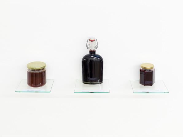 Iranisches Pflaumenmus, irakische Brombeer-Marmelade, saudiarabischer Holundersaft. Sommerernte 2012 von den ehemaligen Botschaftsgeländen in Bonn. ‚Vera Drebuschs Marmeladen und Säfte, die aus Früchten gewonnen sind, die auf Bonner Botschaftsböden ferner Länder gewachsen sind, zielen auf körperliche (also unausweichliche) Weise auf abstrakte historisch politische Vereinbarungen, hier Vereinbarungen über politische Territorien. Die Erde, in der die Pflanzen wachsen, gehört politisch/völkerrechtlich den exotischen (und konfliktbelasteten) Ländern Iran, Irak und Saudiarabien, auch wenn die gut bürgerliche, demokratisch verwaltete Muttererde Bonns nur Meter davon entfernt ist. Der abstrakten Einteilungen eines auf Verträgen beruhenden Territoriums unterliegt immer auch das Stoffliche der Erde, die unmittelbar körperlicher Bestandteil der von ihr lebenden Menschen ist.‘ Pressetext Galerie Nagel Draxler