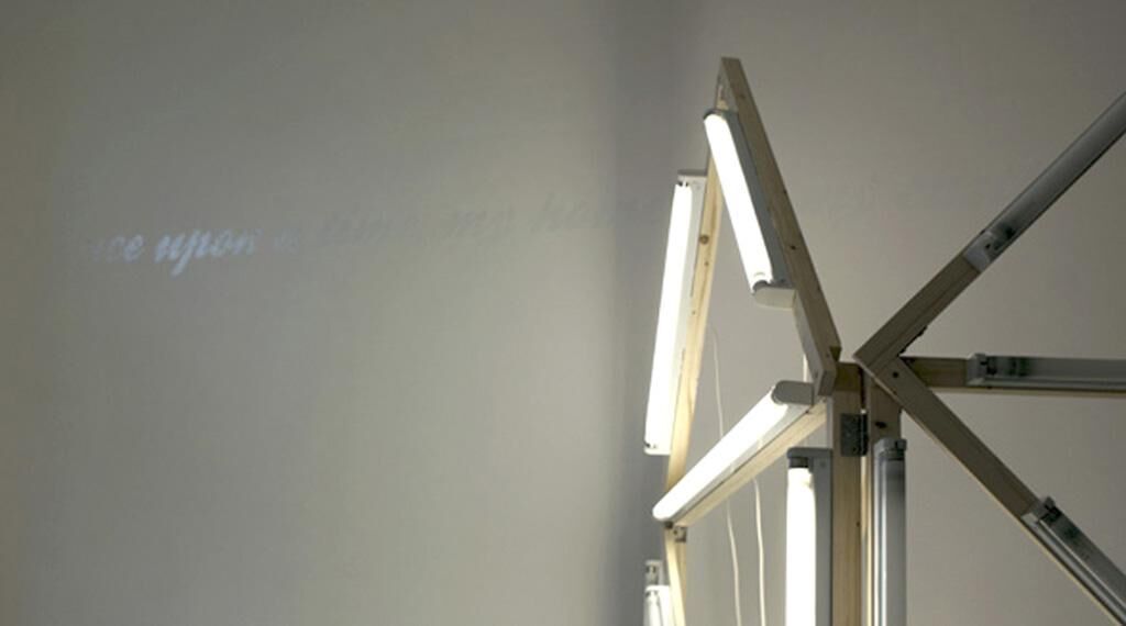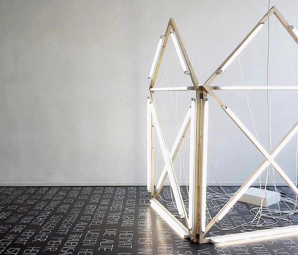 “Once upon a time, my home was my castle” bezieht sich zum einen auf den Beginn eines Märchens, zum anderen auf ein bekanntes Sprichwort. Die illuminierte Abstraktion eines Hauses basiert auf dem “Nikolaus-Problem”, bei dem eine Person das Nikolaus-Puzzle nachzeichnet, ohne dabei den Stift abzusetzen oder eine Linie mehrmals zu ziehen. Während der Zeichnung wird der Reim “Das ist das Haus vom Nikolaus” gesprochen, wobei jedem Strich eine Silbe entspricht. Die Installation handelt von der emotionalen Sicherheit, die man einst in der Kindheit erfahren hat und die mit einem konkreten Ort, dem Zuhause, verbunden ist. Die Handschrift auf dem Boden besteht aus einer Sammlung von Google Einträgen zur Suche “Heimat ist...”. Die Ergebnisse sind so zahlreich, wie vielseitig und spiegeln das Problem, den deutschen Begriff “Heimat” zu definieren.