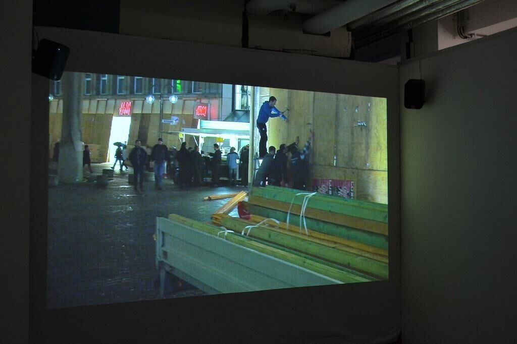 Gebäude werden vernagelt und abgeriegelt, Straßen industriell gereinigt. Ein Rahmen aus Arbeit umschließt eine Unordnung; ein Betrunkener erhofft das Ende.