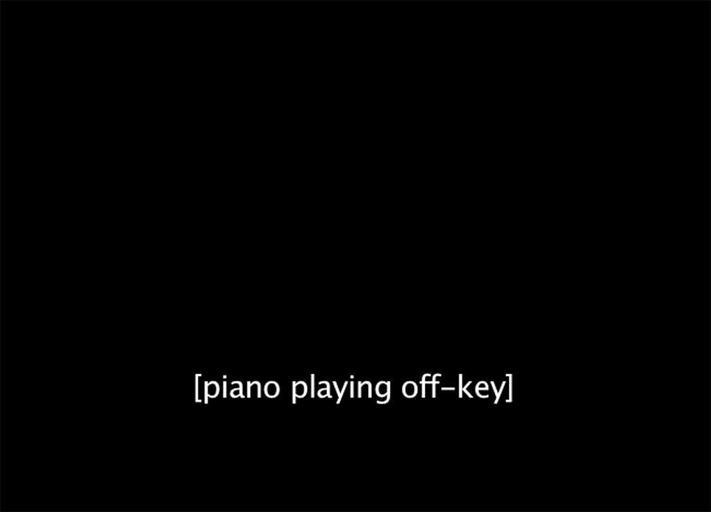 Bei Spielfilmuntertitelungen für hörgeschädigte Zuschauer werden nicht nur gesprochene Dialoge, sondern auch beiläufige Hintergrundgeräusche durch kurze Texteinblendungen übersetzt ('piano playing off-key', 'indistinct chatter', 'melancholic sighs'). Diese unterschwellige Soundkulisse, die beim hörenden Zuschauer unbewusst Affekte wie Angst, Anspannung oder Mitgefühl auslösen soll, ist hier im wörtlichen Sinne zur Sprache gebracht. Es entsteht die paradoxe Situation, dass etwas ursprünglich Diffuses explizit bezeichnet wird. In der Videoarbeit wurden Szenen populärer Kinofilme verwendet, bei denen sich eine Spannung durch das 'Nicht-Hören', 'Nicht-Verstehen' und 'Mutmaßen' aufbaut. Durch die Trennung von Ton-, Bild- und Textebene in der Montage wird die ursprüngliche Narration dekonstruiert und die Erwartungshaltung des Zuschauers gerät in den Fokus.