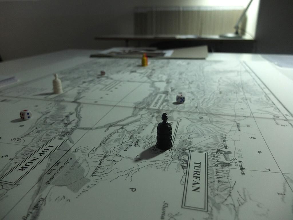 ""if on the silk road, a traveler"" beschäftigt sich mit der Erfahrung von (un)persönlichen Fahrten auf der alten Seidenstraße. Es ist ein Brettspiel, ein Archiv, eine spekulative Archäologie-Sitzung, ein Schreibgerät von möglichen Geschichten, und vieles mehr. Das Spiel bietet den Spielern eine Möglichkeit, geografisch die Seidenstraße entlang voranzukommen und im Laufe dessen eine Reihe von Rollen zu spielen, die sowohl historisch als auch zeitgenössisch, real und fiktiv sind. Ein reichhaltiges Archiv von Materialien, einschließlich Dokumenten, Bildern sowie Videos ergänzt die Rollen und die Spieler werden ermutigt, sie zu lesen, Bedeutungen herauszufinden und darüber zu spekulieren. So wie die Seidenstraße mit all ihren trans-historischen Einwohnern und Reisenden weiterlebt, kann das Spiel theoretisch endlos fortfahren und verweist auf das Gefühl, welches Nietzsches ""every name in history is I"" nicht unähnlich ist.