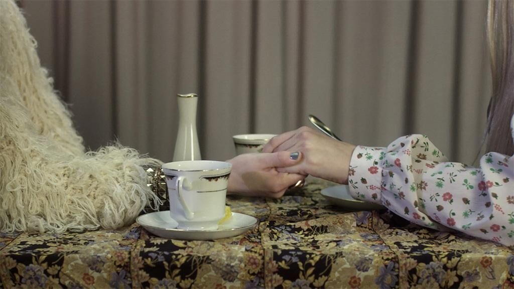Das Gedicht von Marie T. Martin ""Ein Wabenwunsch"" wird in einen anderen Sinnzusammenhang verlagert. Es sind zwei Frauen am Tisch. Text und Bild kommen sich näher und fallen auseinander.