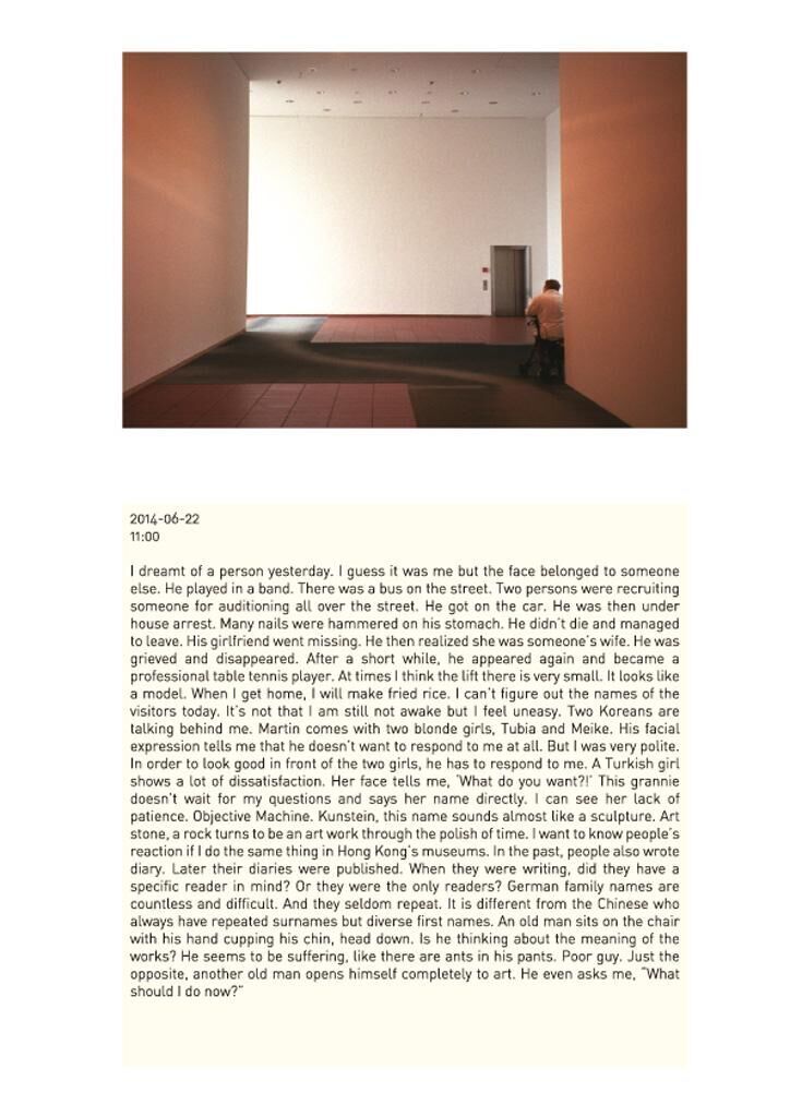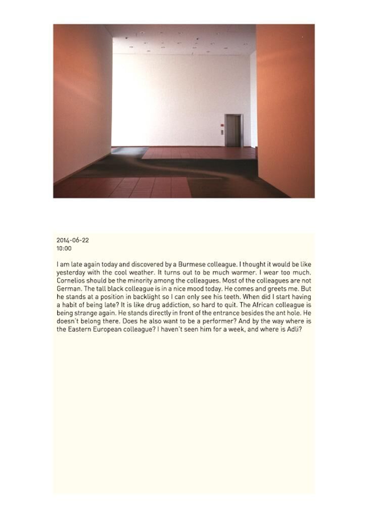 In April 2014, I managed to get a part-time job. I was excited but nervous. It was to work as a performer in Museum Ludwig. I had to dress formal and look decent. So I bought a suit. On the opening day, the artist guided three of us, the ‘name announcers’, by himself. We had to stand at an exact position at the exhibition entrance. We had to ask every visitor for their names and then announce them really loudly into the exhibition space. The job was shift-based. Each shift lasted for 4 hours. I worked 4 shifts a week. At the beginning, it was not easy, especially when I wore a watch. I thought 30 minutes passed, but when I look at my 40-year-old mechanical watch, the minute hand just turned by 30 degrees. In order to kill boredom, I counted how many spotlights there are on the ceiling; how large the space is by counting the number of tiles. I tried different strategies of taking breaks, every 5 minutes for 30 minutes or every 10 minutes per hour, to make things feel faster. I watched the daylight change on the wall. I imagine how the weather changed outside, and how the tourists took photos of the Dom. Another colleague asked me another day, ‘How do you feel standing 4 hours straight?” ‘I don’t feel anything anymore. I just look at the white wall’, I smiled.