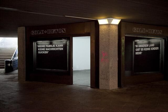 Zitate syrischer Flüchtlingskinder als Plakatserie, zwei Wochen installiert in Dortmund Dorstfeld, in unmittelbarer Nachbarschaft der Hochburg der deutschen Neonazi-Szene. Parallel präsentiert in Schaufenstern eines Ladenlokals in den Kölner Ebertplatzpassagen und auf der Art Cologne. ‚Vera Drebusch bringt Zitate syrischer Flüchtlingskinder per Großplakat in den öffentlichen Raum. Deren Aussagen „IN UNSEREM LAND GIBT ES KEINE KINDER MEHR“ oder „MEINE FAMILIE KANN KEINE NACHRICHTEN MEHR GUCKEN“ sind aufgrund fremdsprachlicher Einschränkungen zweideutig: gibt es keine Kinder mehr weil alle geflüchtete sind - oder gibt es keine Kinder mehr, weil alle Kinder in kürzester Zeit aufgrund der Erlebnisse erwachsen wurden? Sind alle Fernseher zerstört - oder sind die Nachrichten im Fernsehen für die betroffenen Familien schlicht unerträglich?‘ Heike Ander