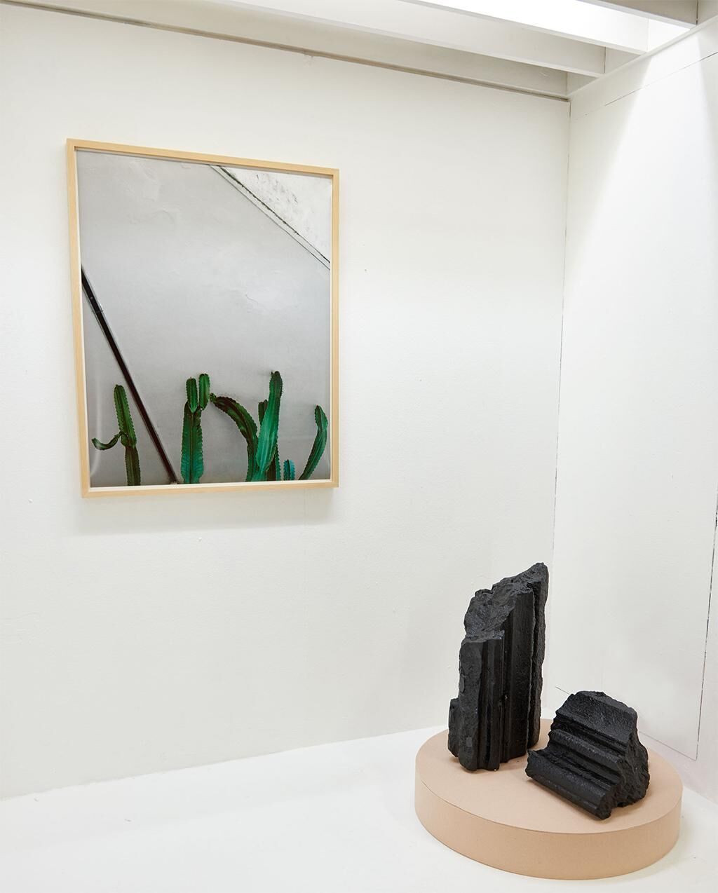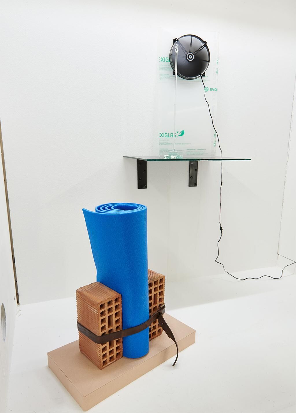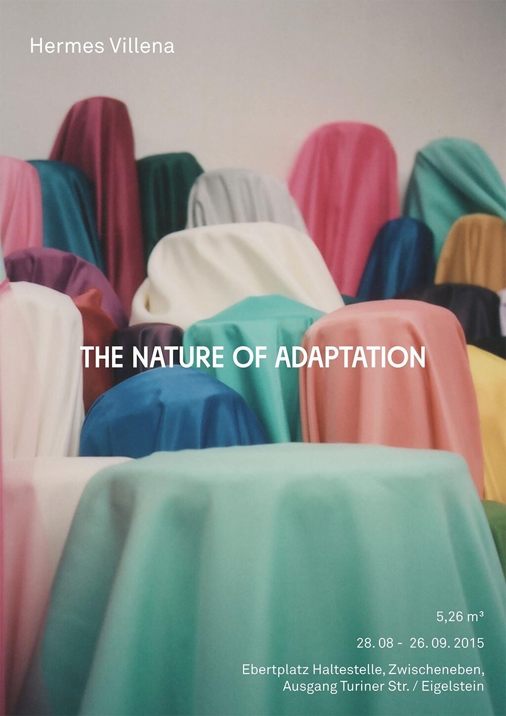 Ein Foto im Holzrahmen, das Motiv zeigt ein verlassenes Gebäude im wirtschaftlichen Zentrum São Paulos: eine von diagonalen Linien unterbrochene Betonwand, vor die sich fingerhaft aufragende Kakteenarme schieben. Zwei schwarz lackierte Steinbrocken, reliefierte Trümmer aus dem ehemaligen Kölner Club „Stecken“, stehend und liegend drapiert auf einem kreisförmigen Sockel, mit hellem Filz überzogen. Ein weiterer solcher Sockel, diesmal langrechteckig, mit einem Ensemble aus zwei roten Hohlziegeln, die eine blaue Isomatte einfassen, von einem Ledergürtel umschnürt. Ein an die Wand montiertes Regalbrett, das eine Plexiglasplatte inklusive Schutzbeschichtung trägt, die ihre Herkunft verrät; darin eingelassen ein arbeitender Ventilator, eingesetzt zur Belüftung von Computern und entfernt an Duchamps Rotoreliefs erinnernd. Hinzugesellt eine gläserne Stele, die sich als ein Flaggenhalter ohne Flagge entpuppt. Diese vier Elemente befinden sich in einer Kommunikation miteinander, in der sich immer wieder neue Paare zusammenfinden. Ihr Zusammenspiel fragt nach einer Entsprechung der Formen, aber auch nach einer Entsprechung der mit ihnen verknüpften Bedeutungen, etwa in der Gegenüberstellung von Ziegeln als Material zum Bauen und bereits verbautem, nun verfallenem Material, zukünftiger und ehemaliger Behausung, Transit. Die sich aufbauenden Assoziationsketten sind eingespannt in dieses vergleichende Sehen, das gerahmt wird von dem Titel als fünftem Element: The Nature of Adaptation, das Wesen der Anpassung. Er verstärkt den Aspekt des Zusammengeklaubten, der sich bei der Ansicht dieser verschiedenartigen Komponenten ergibt: Gefundenes oder Gekauftes, mitgenommen als Foto oder als Objekt selbst, zusammengestellt in und zu dieser Kompositstruktur, die sie in ihrer Verschiedenartigkeit einander gegenüberstellt und ihnen ein neues Leben, neue Bedeutung verspricht abseits von dem, was als ihre ursprünglichen Stand- oder Einsatzorte bezeichnet werden könnte. Der Bildausschnitt ist gewählt, die Oberfläche verändert, die Objekte zusammengestellt, die Auswahl hergestellt: Das Ausgestellte hat seine Momente der Anpassung bereits erfahren, wie es, so suggeriert der Titel, in seinem Wesen als Ausgestelltes liegt. Die unterschiedlichen Arten, auf die das geschah, verhandeln traditionelle wie zeitgenössische Arten der Adaptation von Dingen, die einem begegnen, der Einverleibung in einen Prozess der Kreation. Villena geht es hier um die Art und Weise der Behandlung der Dinge selbst: Anpassung als Überlebensstrategie im Alltag wird erweitert zu Anpassen als künstlerische Handlungsweise im Umgang mit Dingen, die auf einen zukommen. Außerhalb von positiven oder negativen Konnotationen wird das Anpassen so als gestaltender Prozess begriffen, der eine solche Umwandlung als Tatsache begreift. Veränderung, sagen die angepassten Elemente, impliziert immer Gewinn und Verlust zugleich. Jenny Dirksen.