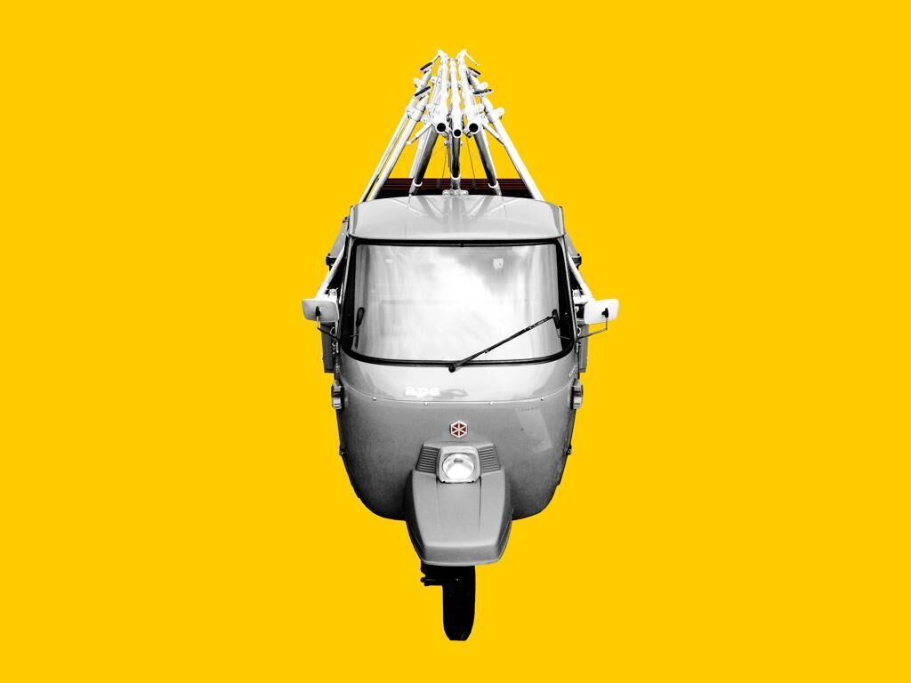 piano [pjano‘] - der Plan, das Programm, die Ebene, die Plattform, das Niveau, der Stand (adv.) leise, sachte, langsam, leicht ""Piano"" ist eine Plattform für Interventionen im öffentlichen Raum, mobiles Leben und Arbeiten. Aus Aluminiumrohren, Rohrverbindern und gespannten Stahlseilen ist auf der Pritsche einer Piaggio Ape P501 ein ausklappbares Gerüst montiert. Mit dem kleinen, starken und besonders wendigen Mobil kann man in die kleinsten Ecken urbaner und natürlicher Räume vordringen und instantan variable ephemere Räume errichten. Das modulare System erlaubt die vielseitige Gestaltung verschiedener Raumkonzepte unterschiedlicher Kohärenz. Fließende Räume, die sich mit ihrer Umgebung verbinden. Das Definieren von Raum, als Arbeits- und Lebensraum, für Interventionen, ortsbezogenes Arbeiten und performative Aktionen steht in seiner vielgestaltigen, modularen und mobilen Form entgegen der weitläufigen Idee, die Stadt, den kulturellen Raum, als ein eher fixes und stationäres Konstrukt zu verstehen und ist damit auch Referenz zu Stadtutopien avantgardistischer Architekturgruppen wie Superstu dio, Archizoom, Archigram oder Ant Farm, die ihren örtlichen und zeitlichen Ursprung, ebenso wie die Ape, zu großen Teilen im Italien der 50er/60er Jahre finden. Ein Hauptaspekt der Konstruktion liegt darin, aus einem Minimum an Raum, Material und Gewicht ein Maximum an Form, Fläche und Nutzen zu schaffen. Die klappbaren Füße und Streben werden durch robuste Spanngurte eingestellt und unter Spannung gebracht. Durch dieses Netz aus Kompressions- und Tensionskräften ensteht ein äußerst stabiles Gerüst mit einer guten Kräfteverteilung. Ein wesentliches Element stellen die 10 Platten dar, welche sich in 2 Reihen á 5 Stück in das Gerüst einklemmen lassen. Durch diese lässt sich in etwa 2m Höhe nicht nur die 2x3m große Plattform errichten, sie bilden auch eine wesentliche Grundlage der Gestalt und Funktion der unterschiedlichen Räume. Bei jeder dieser Platten lässt sich ein Drittel der Fläche aufstellen, so dass diese auf der Plattform als Tisch funktionieren. Die Platte lässt sich in beiden Richtungen in das Gerüst integrieren, so dass der Tisch sowohl außen wie in der Plattformmitte liegen kann. Darüber hinaus lassen sich die Platten auch jenseits der Plattform am Boden als stabiler Tisch aufstellen. Auch hier kann der eine Teil aufgestellt werden, so dass ein Tisch mit zwei Ebenen entsteht und damit eine erweiterte Funktionalität bietet. Ein teilweise oder komplett geschlossener Raum entsteht durch ein Zelt über der Plattform.