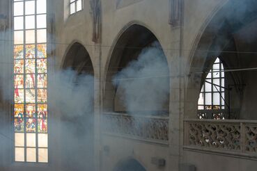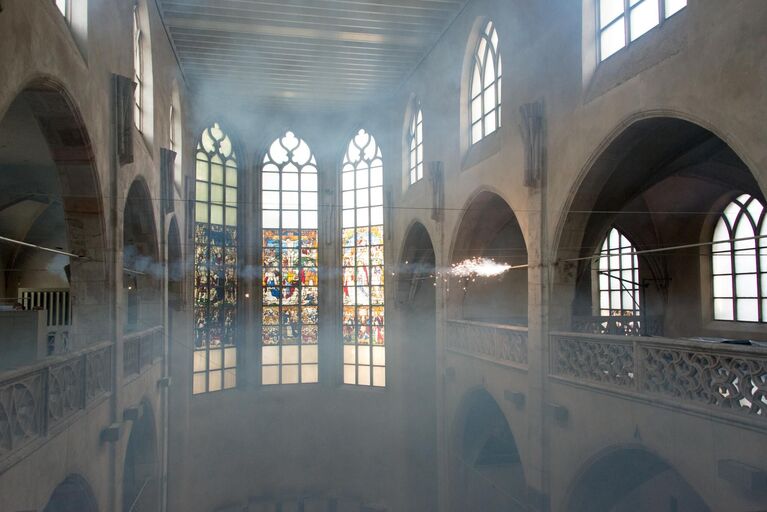 Die Konzert-Installation BOOM FREQUENCY lässt zwei musikalische Dialogpartner aufeinandertreffen, deren Verhältnis eigentlich von einer strengen Hierarchie geprägt ist: Beim Zusammenspiel von Musik und Feuerwerk übernimmt das Feuerwerk normalerweise eine untergeordnete Rolle. Es untermalt die musikalischen Bewegungen und fügt ihnen eine spektakuläre, visuelle Komponente hinzu. Zusammen mit dem Organisten Dominik Susteck habe ich die Grundlage für eine konzeptionelle Improvisation in festem Rahmen entwickelt, die Feuerwerk und Orgel als kammermusikalische Duopartner gleichwertig aufeinandertreffen lässt. Mit den spezifischen Tönen von Schnurraketen und dem Knistern von Silberwasserfällen wurde in der Kirche Kunst-Station St. Peter der Kölner Jesuitengemeinde das Feuerwerk zurück in die Kirche geholt und die klanglichen Qualitäten pyrotechnischer Effekte zum gleichwertigen Mitspieler gemacht.