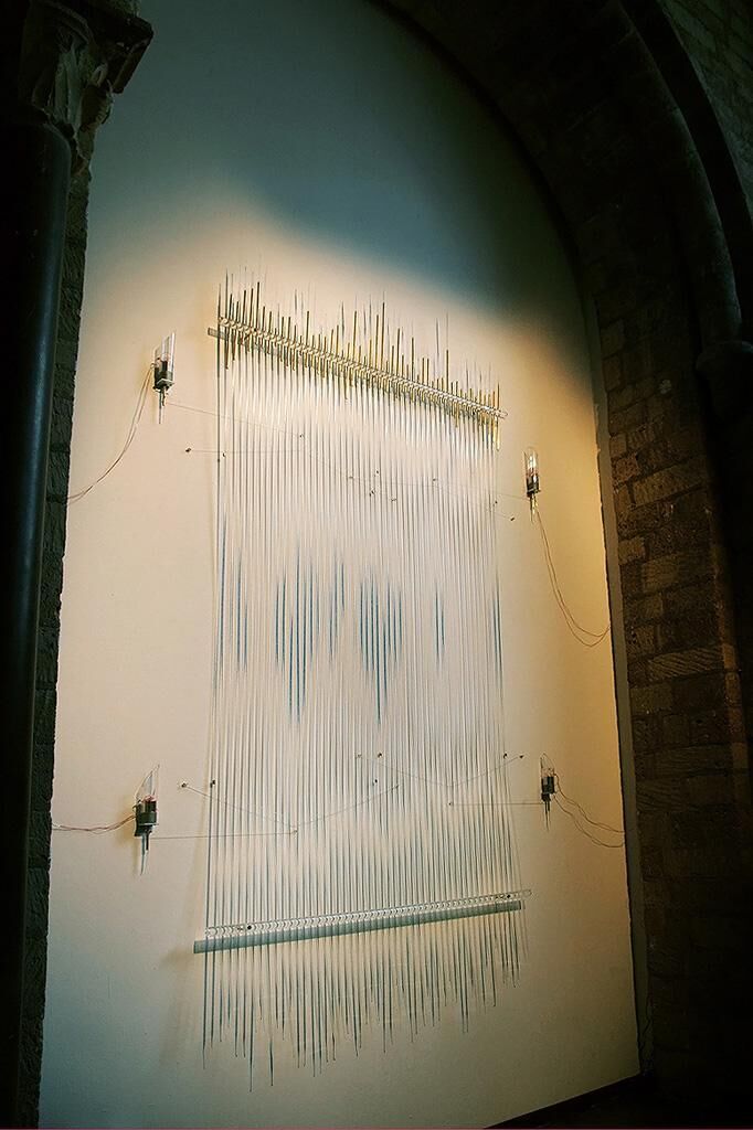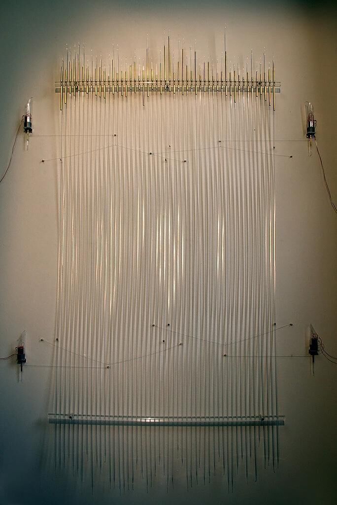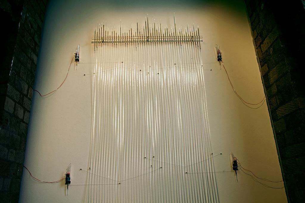 “Awake to breathe, Breathe to merge into light. Stand to confront with own shadow, like to hear the sound from tranquil mirror.” “Shadow Fugue” is a light-sound apparatus which is responsive with the state of the own body’s physical tension and change of light. Like breathing, the winding and loosing wires, which are fastened between motors and the wall, let plexiglass rods tighten and loosen. Through its movement when these plexiglass rods are bended to the wall and touch the surface of the wall, the bright ray of light and at an instant the black stripe of a shadow emerge - depending from where it is observed. The emerging light phenomenon by this various kinetic movements reminds the observer of organic and symptomatic gestures. It needs the self-regulation process as the movement is measured real-time by infrared light sensors. The sound moves after the rotation of motors and the own threads of sounds are weaved by tension. Like 4 voices of Fugue, it is real-time generated by the breathing of “Shadow Fugue”. In this work, the shadow is not the place where the light is unreached but the interface where the light starts to travel again.