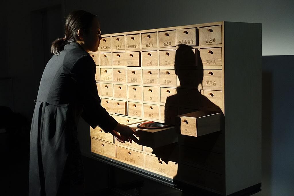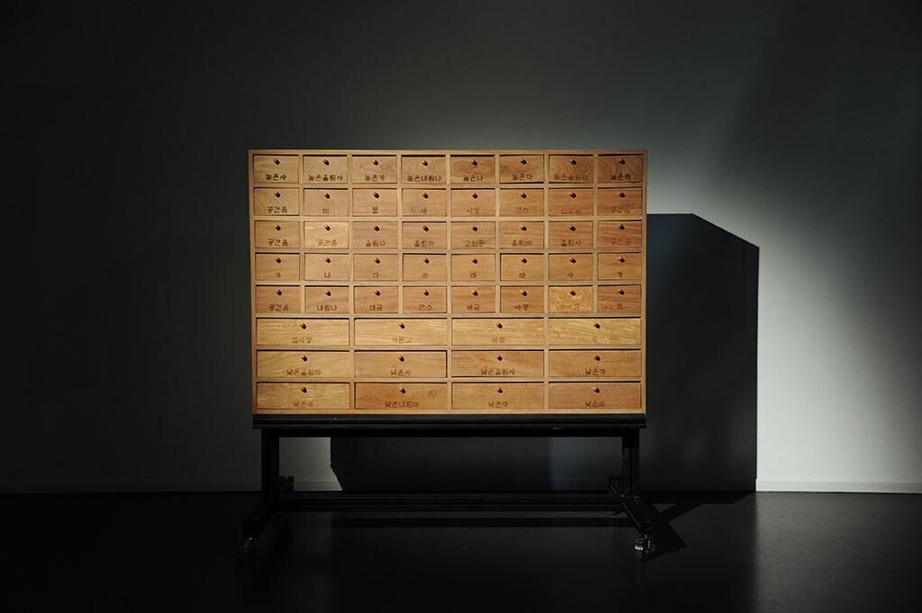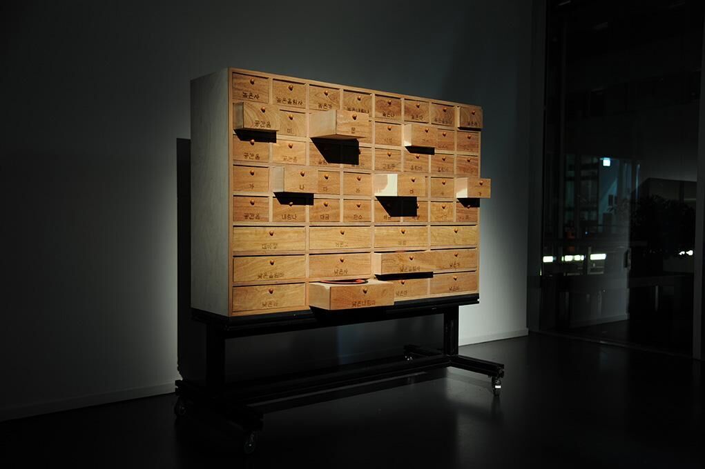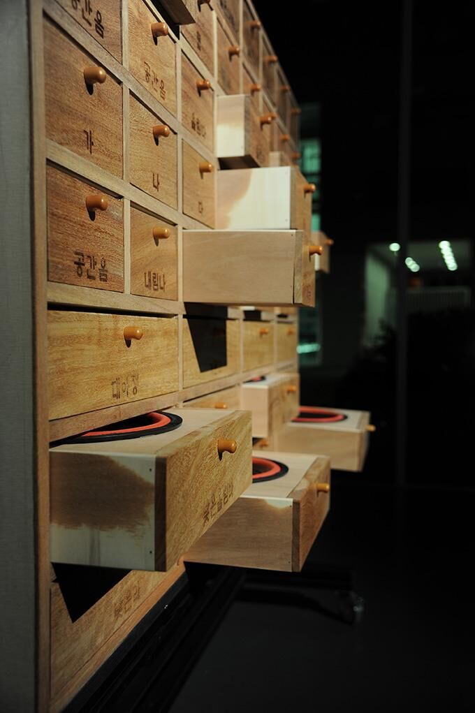 Dinge verschwinden in Schubladen und geraten in Vergessenheit. Dinge aus Schubladen herausziehen – zahlreiche unverwirklichte künstlerische Ideen, nicht durchgeführte Absichten oder unaufgeführte Stücke von Komponisten bleiben oftmals in Schubladen liegen. Jahrzehntelang, manchmal sogar ewig. Die Performance verleiht vergessenen Dingen wieder Leben, misst ihnen neuen Wert bei. Werden die Schubfächer geöffnet, tritt Licht ins Dunkel und die inneren, verborgenen Klänge werden hervorgebracht. Jede Schublade birgt ihren eigenen Klang: Naturklänge, Geräusche, Tonfolgen westlicher und asiatischer Musik gespielt von unterschiedlichsten Instrumenten. Ein Klangkosmos, der sich öffnet. Lautstärke, Intensität und Länge, das An- und Abschwellen der Klänge werden durch das Öffnen geregelt. Unterschiedlichste Kombinationen erzeugen eine nicht zu erschöpfende Vielfalt an Kompositionsmöglichkeiten. Der Performer übernimmt die Rolle des Komponisten, die Aufführung wird zum Konzert. In Erweiterung ist das Live-Zusammenspiel mit Instrumenten möglich, so u.a. mit der Gayageum, einem traditionellen koreanischen Saiteninstrument. Wie bei einem traditionellen koreanischen Schrank geben die Inschriften der Schubfächer Auskunft über ihren Inhalt.