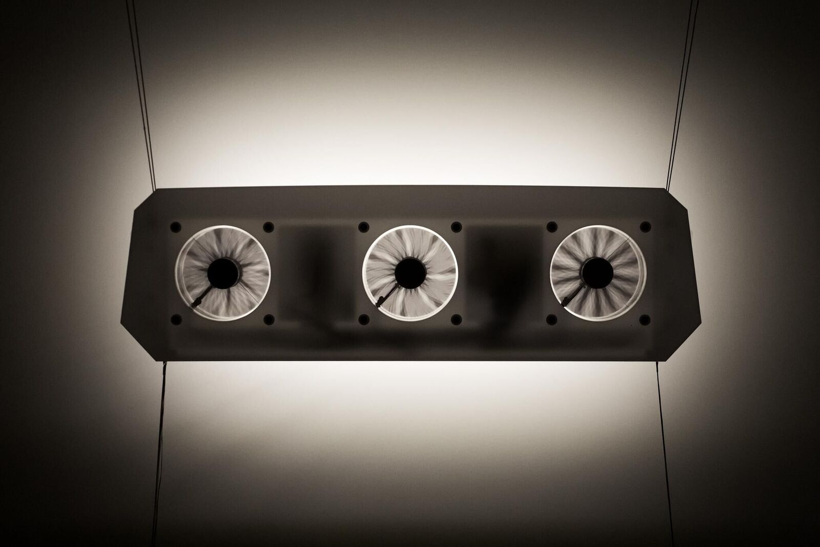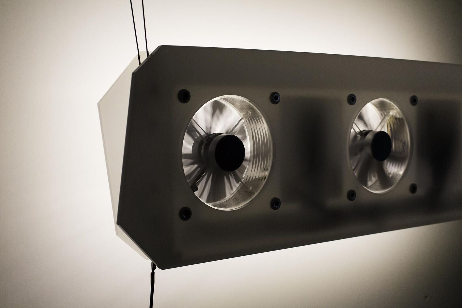 Bei der Arbeit mit dem Titel „horizontal computer-based wave healing“ handelt es sich um eine elektronische und kybernetische Skulptur. Die sechs verbauten Lüfter erzeugen durch die dauerhafte Variation ihrer Drehzahlen sich ständig verändernde, optische Effekte. Zwei Lüfter sind jeweils hintereinander angeordnet und drehen in gegenläufige Richtung. Beim Betrachten der Lüfterpaare vernimmt man die eben erwähnten Effekte. Die Berechnung der unterschiedlichen Drehzahlen geschieht in einem komplexen, programmierten System. Auch die Daten und Werte, die verschiedene Sensoren innerhalb der Skulptur ermitteln, dienen als Variablen innerhalb dieses Berechnungssystems. Von der Drehzahl der Lüfter modulierte Audio-Oszillatoren erzeugen zusätzlich eine dichte, sich stets verändernde Klangebene. Die Gleichschaltung der auditiven und optischen Frequenzen bietet dem Betrachter zum einen die Möglichkeit einer immersiven Erfahrung mit Skulptur und Raum und zum anderen die Gelegenheit zur Transzendenz. #successthroughwavehealing #brainwellness #computermeditation #happiness #stoptheskepticism