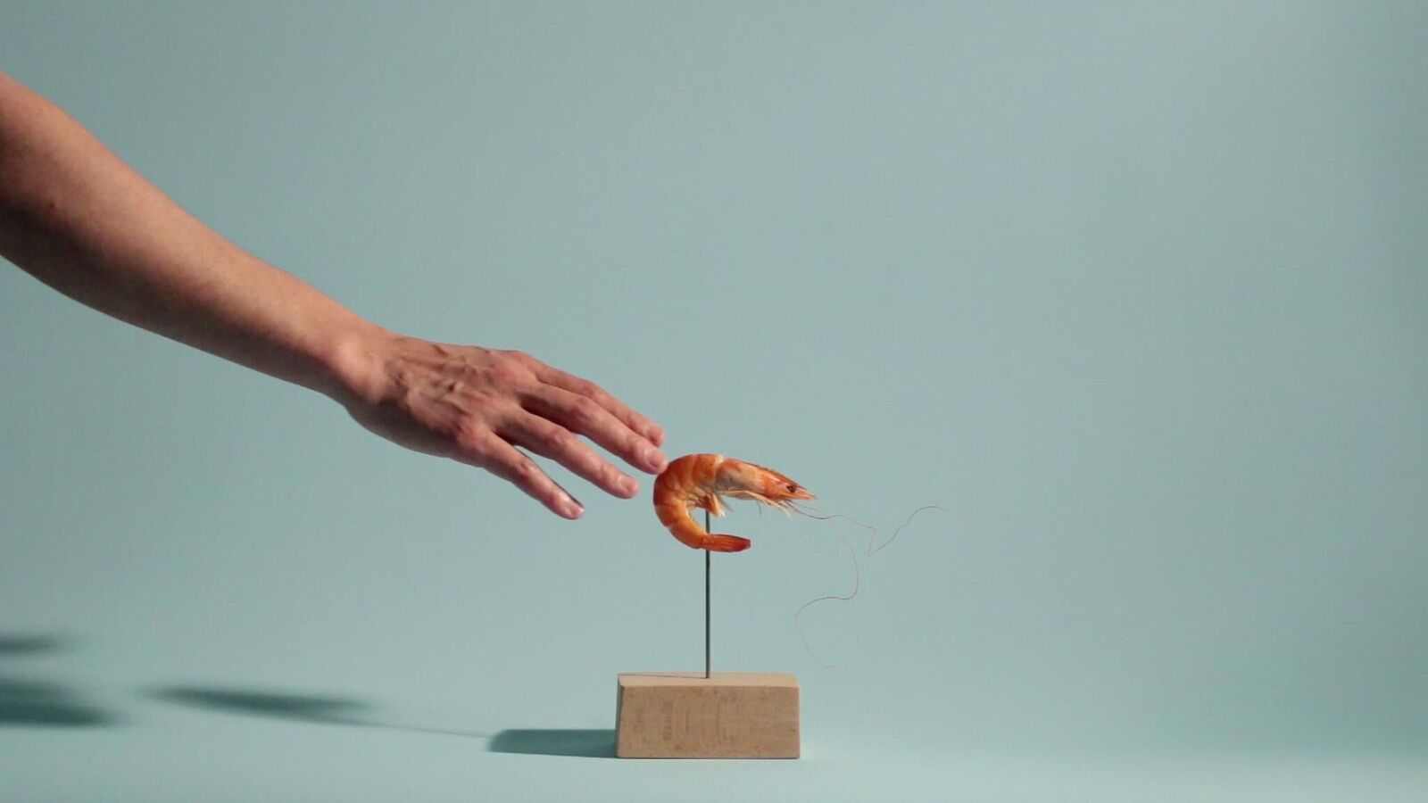 In einem sterilen, bläulichen Raum erscheint eine Krabbe. Eine Frauenhand nähert sich ihr, um sie zärtlich zu berühren.