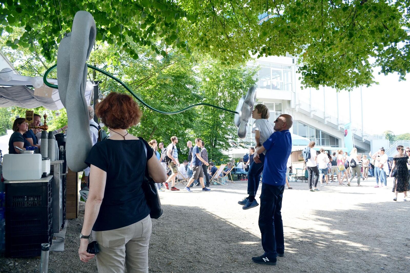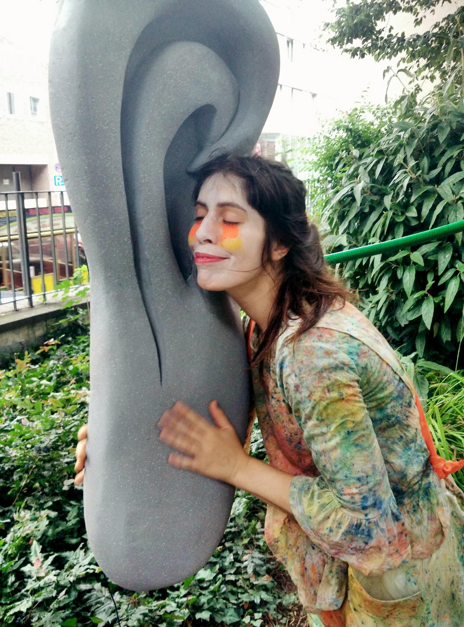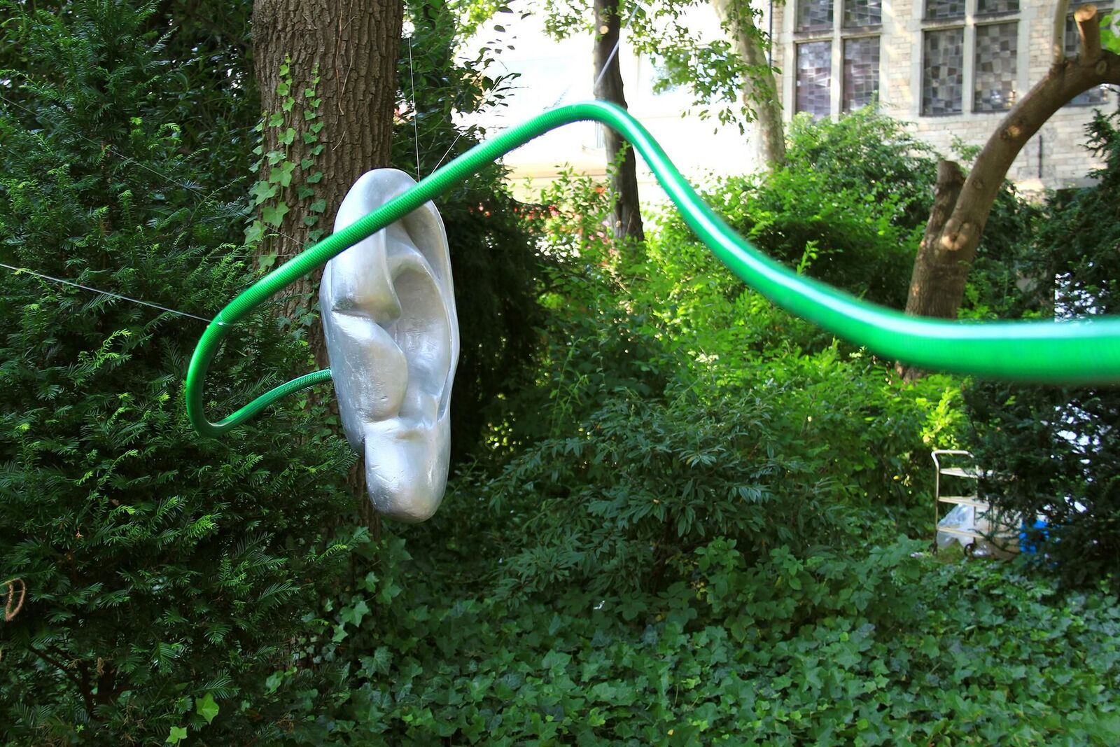 Wir nehmen jeden Moment Klänge um uns aktiv oder passiv wahr. Die Informationen wehen ständig zu unseren Ohren hinein und hinaus: Welche davon bleiben in uns erhalten? Im Chinesischen gibt es die Redewendung: „In das linke Ohr hinein und aus dem rechten Ohr hinaus“, welche anschaulich beschreibt, wie oftmals gerade aufgenommener Informationsinhalt sofort wieder in Vergessenheit gerät. Die kommunikative Interaktion zu den Ohren wird durch ein Funkgerät umgesetzt. Die Künstlerin tritt mit den beiden Ohren und somit auch mit den Besuchern in Kommunikation.