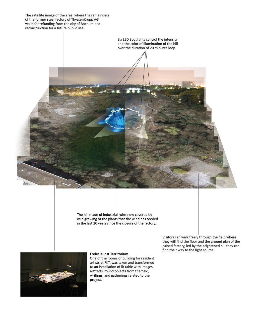 ""The Nature of Things"" konfrontiert die industriellen, städtischen, historischen und natürlichen Phänomene des Brachlands der ehemaligen Fabrik von Tyssenkrupp in Bochum und dessen Umgebung im Ruhrgebiet mit der minimalen Geste der Architekturbeleuchtung eines sich in der Mitte dieses leeren Grundstückes befindenden Hügels. Ein grüner Hügel, mit Bäumen und Sträuchern bedeckt, sieht auf den ersten Blick natürlich aus, kommt man näher, erkennt man, dass er in Wirklichkeit aus den Resten der Industrieruinen und des Abfallmaterials der Stahlindustrie, die dort installiert wurde, entstanden ist. Im Laufe der Zeit wurde dieser Hügel ebenso wie die gesamten 20 Hektar um ihn herum von der Natur eingenommen. Ein DMX-Mixer kontrolliert sechs LED Lichter und animiert deren Farbe unbemerkbar über einen Zeitraum von 20 Minuten. Dem Licht folgend können Besucher die postindustrielle Ruine, die in der Nacht wie ein Signalfeuer scheint, entdecken. In einem Raum des ehemaligen FKTs präsentiert die Installation eine Collage aus Fotografien, Skizzen und Objekten, die unsere Recherche und verschiedene Aspekte der Gegend zeigt.