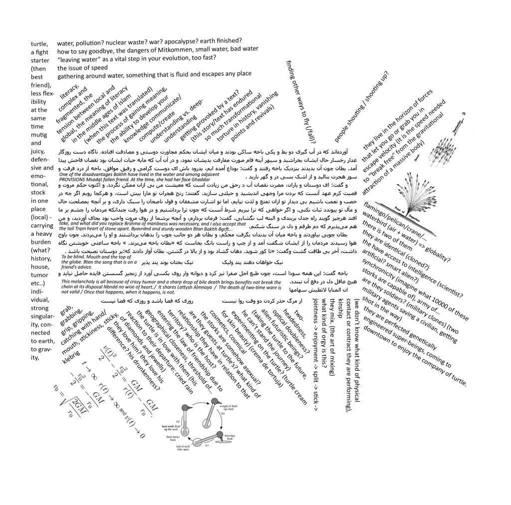 Die Lecture Performance setzt sich die Übersetzung des sehr alten Gleichnis des berühmten Hybrid-Texts Panchatantra (Farsi: Kelileh o Demneh) durch verbale Kommunikation, Licht, Schatten, Körper und Klang zur Aufgabe. Die Performance trainiert die Klassiker des Geschichtenerzählens und das Experimentieren mit den narrativen Elementen der Geschichte. Panchatantra sind Tierfabeln, die so alt sind, wie wir es uns gerade noch vorstellen können, und die in ihrer Geschichte viel transformierende Folter, Fluchtpunkte und Wiederaufnahmen ertragen haben. Nun existiert sie im alten Farsi (mit dem Titel Kalila und Dimna کلیله و دمنه) als ikonisches Transkript und Zeugnis für einen alten Sprach-Hybrid zwischen Farsi und Arabisch. Das Lesen dieser Geschichte auf Englisch und die Zusammenarbeit mit nicht-iranischen TänzerInnen öffnet zeitgenössische Themen entlang der Stimme des Alten. Wenn die Geschichte von der Schildkröte und den zwei Störchen (حکایباخه و دو بط) mit chirurgischer Sorgfalt betrachtet wird, bietet sie den Reichtum, mit sprachlichen und dekonstruktiven Tools ein Umdenken möglich zu machen. Die Geschichte ist bereits reich an Themen wie Alphabetisierung, Wissenschaft, Freundschaft, Raumfahrt, Umweltverschmutzung, Evolution, virtuellem Raum, Sprache und Rede.