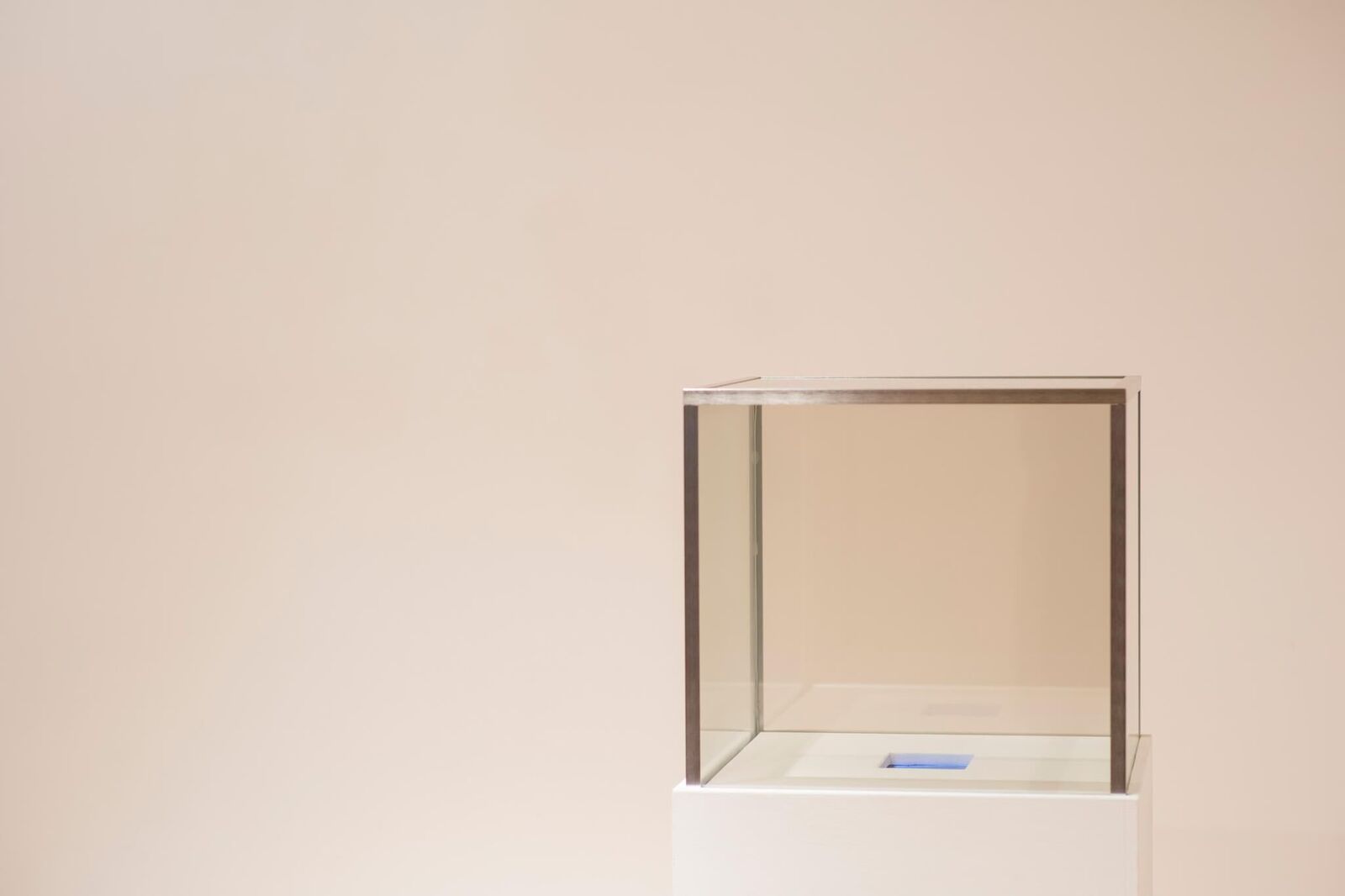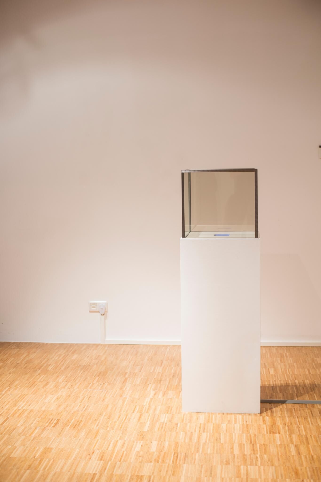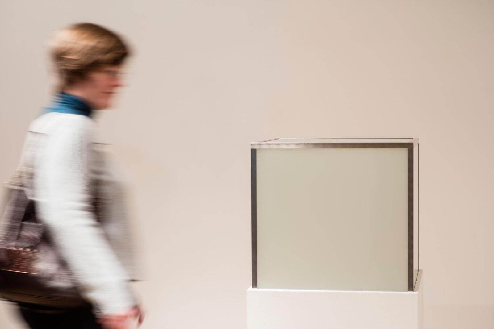 In der Ecke eines weißen Raumes steht ein gläserner Würfel auf einem weißen Sockel. Mittig in seine Bodenfläche eingelassen leuchtet ein Monitor bläulich und zieht die Blicke der Herantretenden auf sich. Plötzlich verändert sich das Glas des Würfels. Seine bisher durchsichtigen Wände werden milchig weiß und verwehren die Sicht in das Innere der Vitrine. Was auf dem Monitor zu sehen ist, bleibt ein Geheimnis. Nähert sich eine Person dem Würfel, erfasst ein Kamerasystem ihre Anwesenheit. Ein Computerprogramm vergleicht kontinuierlich das Referenzbild des leeren Raumes mit aktuellen Bildern, welche die Kamera mehrmals pro Sekunde macht. Bei einer Abweichung verursacht ein elektrischer Impuls einen Spannungsabfall der auf dem Glas befindlichen Flüssigkristallfolie, die dadurch undurchsichtig wird. ""White Cube"" konfrontiert die Rezipierenden mit ihren Erwartungshaltungen. Eine Störung wird ausgelöst und macht die vielfältigen Wechselbeziehungen zwischen Mensch und Elektronik, BesucherInnen und Ausstellungsraum, Erwartung und Realität sicht- und erlebbar. Der Begriff „White Cube“ umschreibt das Ausstellungskonzept, Kunst in vermeintlich neutralen weißen Räumen zu präsentieren. Der „weiße Würfel“ dient als institutionelle Kulisse, das Gezeigte soll in den Vordergrund rücken. Die Idee eines statischen, vorgeblich zeitlosen und vom Leben getrennten Ausstellungsraumes wird durch das Kunstwerk von Benjamin Adams ad absurdum geführt. Die Undurchschaubarkeit des Würfels wirft die Frage nach der eigenen Rezeptionshaltung auf, der Akt des Betrachtens an sich wird zum Thema. White Cube ist somit auch als verzerrtes Spiegelbild einer Institution zu verstehen, welches die Betrachtenden auf sich selbst, ihre Erwartungen und ihre Rolle als Akteure im Kunstsystem zurückwirft. Mit dem Diktum des Medientheoretikers Marshall McLuhans wird hier das Medium zur Nachricht, respektive zum Inhalt. Licht wird zum Träger, Partizipation wird zur Frage der Wahrnehmung.