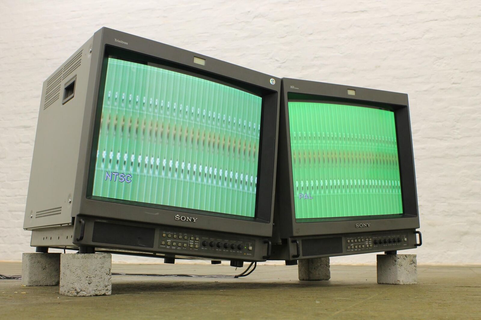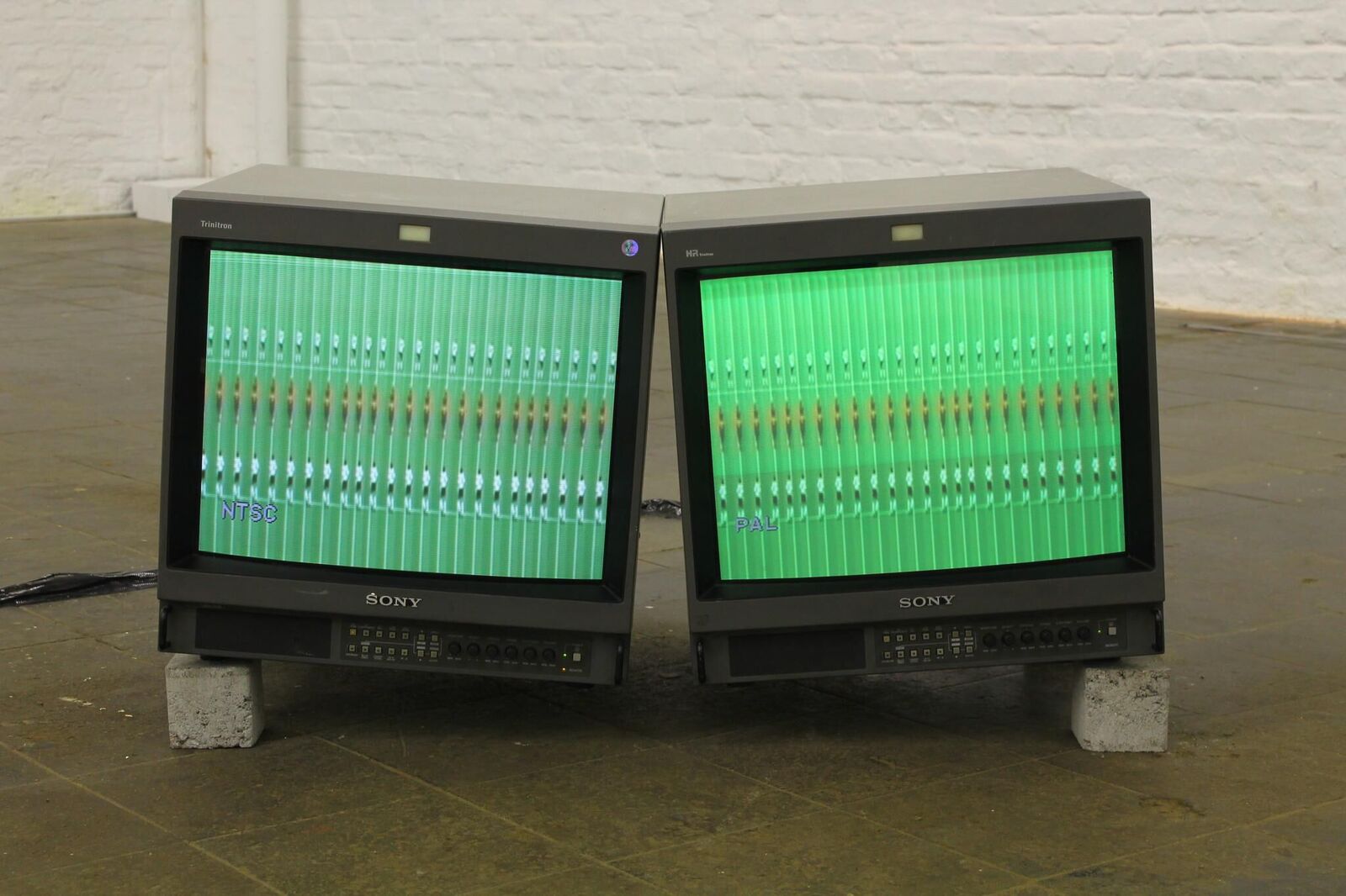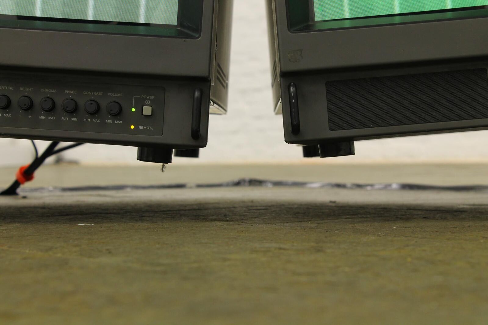 The current piece propose a dialogue between two objects, as well as, two video sources from media. Video monitors that keep in balance against each other, emits TV 90s football match footage between Germany and Colombia, as well as Audio News from Colombia (murder of a presidential candidate, drugs, cartel, etc) and Germany (Berliner Mauer Fall) respectively. The influence of media in cultural structures is definitive in all such processes. No matter how or where, media creates an abundant ocean of data. Is such structure able to remain in balance?