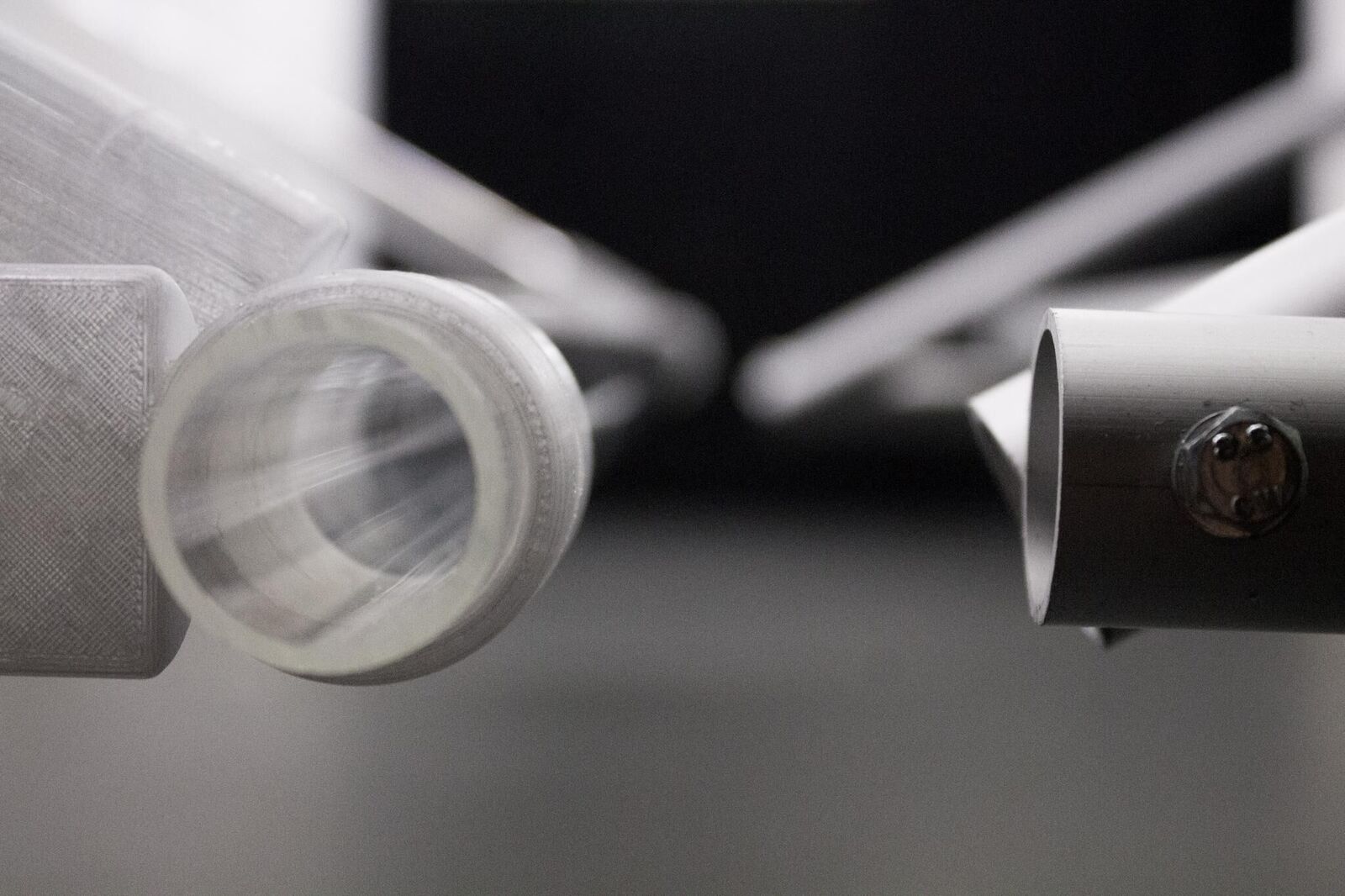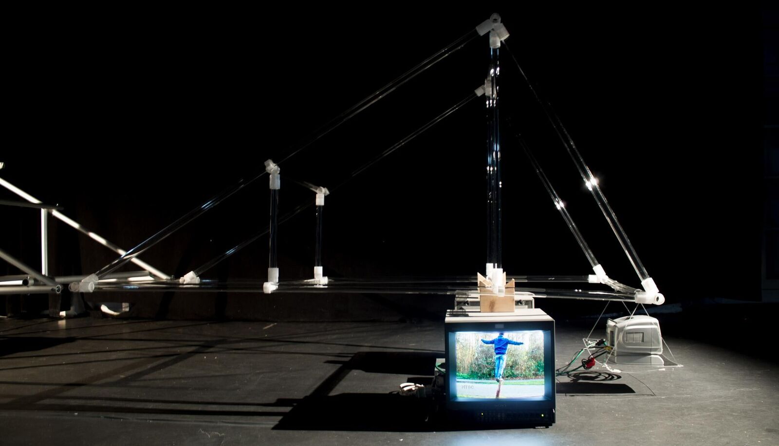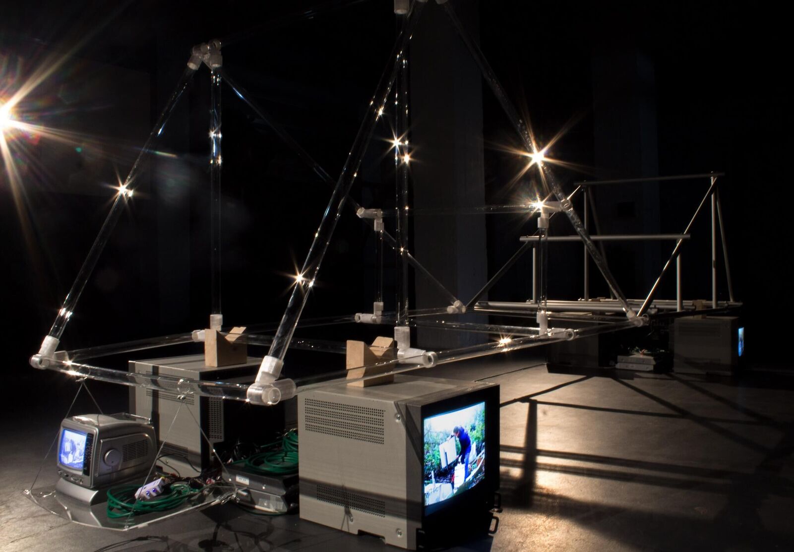The current work is a mixed media video sculpture composed by a set of televisions acting as foundations and counterweights for a bridge consisting of two halves made from Aluminum and Plexiglas respectively. In each monitor video performances are emitted simultaneously in PAL and NTSC TV systems, alluding to impotence and insistence, as well as belonging, equilibrium and absurd.
