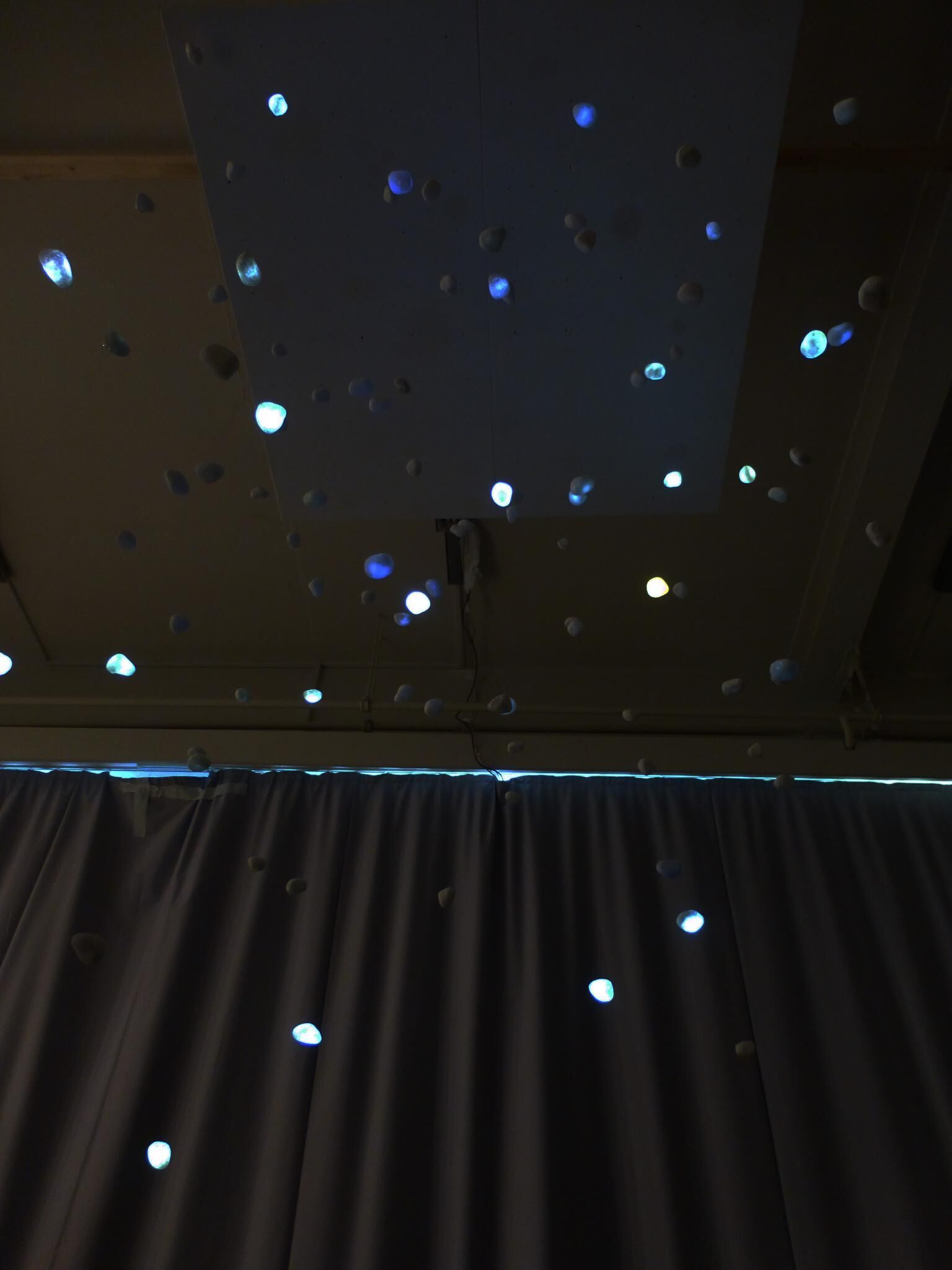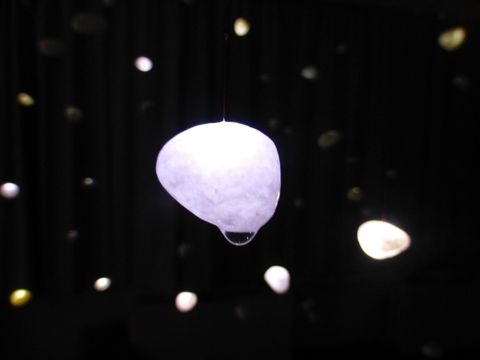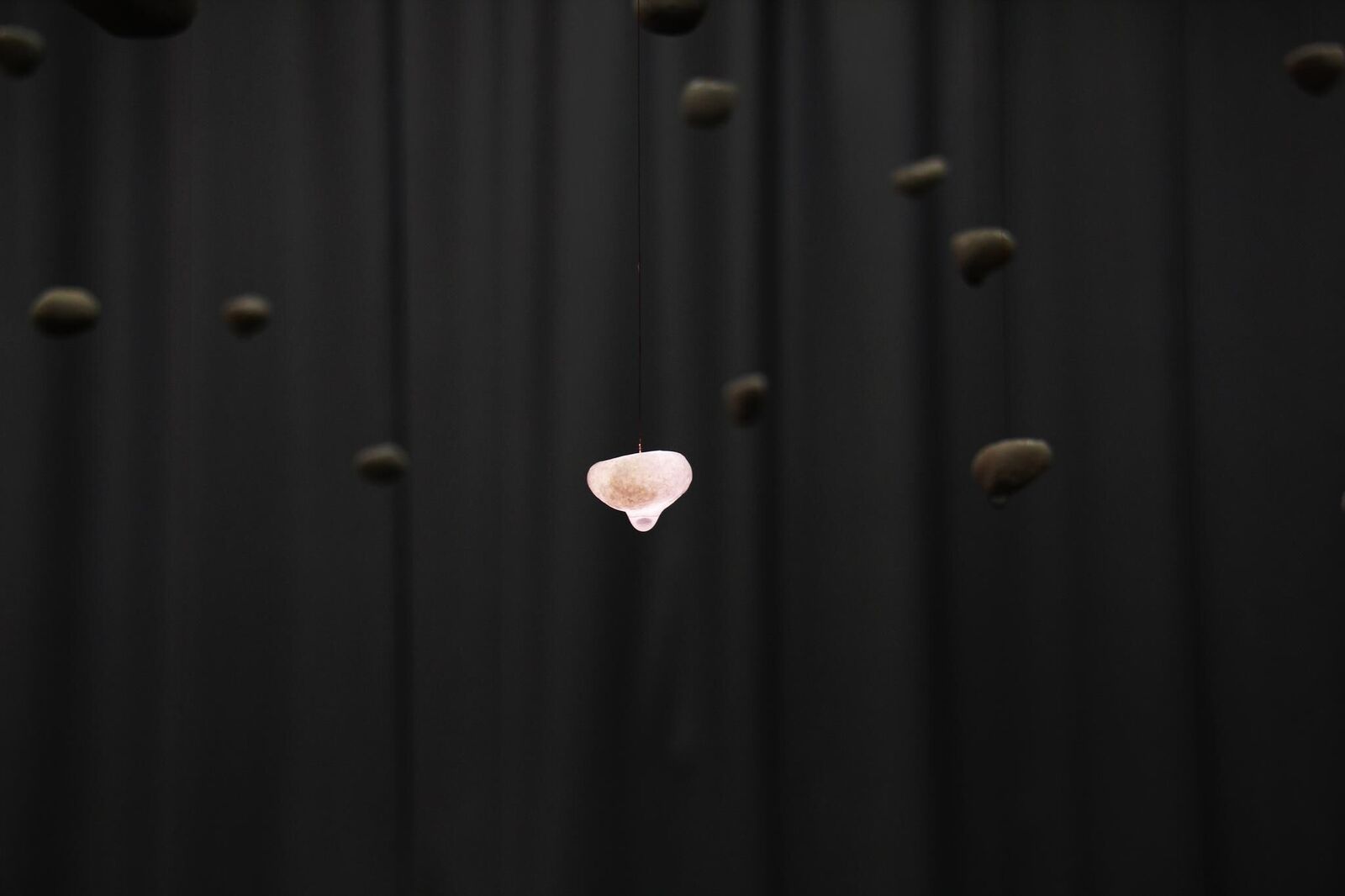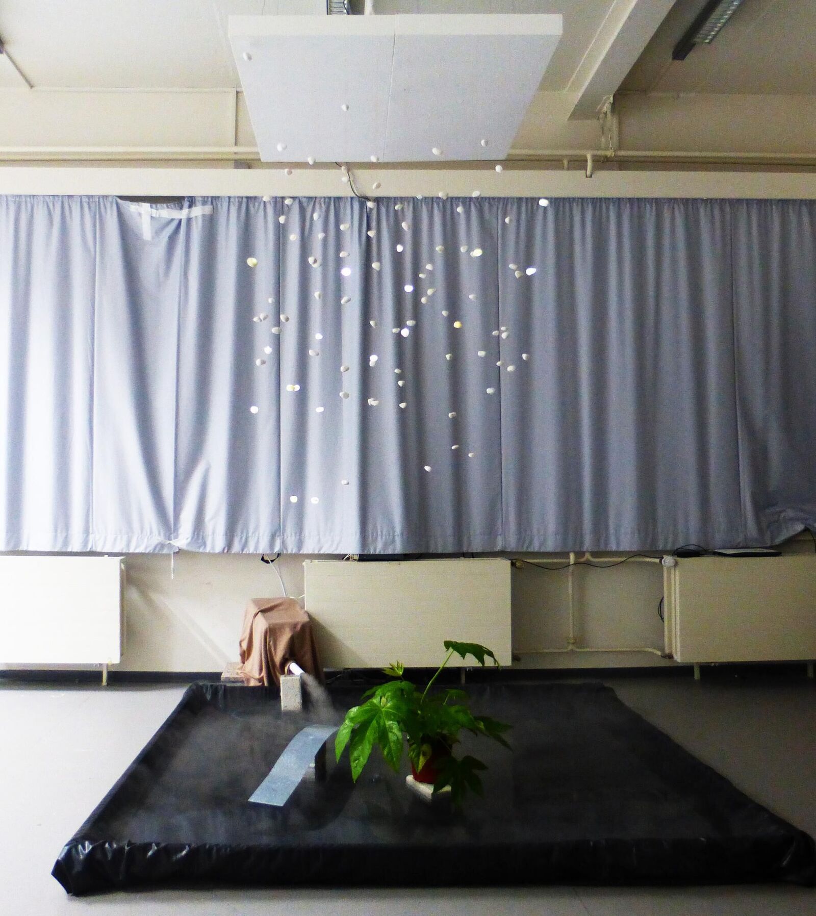 Dies ist ein Arbeit, die mittels Steinen und Wasser ein klammes und flüsterndes Gefühl auslösen möchte. Wir wissen, dass die Natur ihre eigene Sprache hat, ich denke, dass diese Arbeit es ermöglicht einen Teil dieses Dialogs hörbar zu machen. Durch die Kombination von natürlichen Materialien und visuellen/akustischen Effekten soll eine feuchte, ruhige und natürliche Atmosphäre erzielt werden. Steine und Wasser, eine Kombination von hartem und weichem Material. Das Wasser läuft oberflächlich über den Steinen und tropft anschließend vom Stein in Richtung Boden zu einem Saiteninstrument. Dieses Werk besteht aus drei Teilen, die gewählten Hauptmaterialien bestehen dabei aus Stein und Wasser. Der erste Teil ""Steine"", c.a. 100 Stück, wird fast unsichtbar aufgehängt. Der zweite Teil der Arbeit, ""das Wasser"", fließt durch ein Rohrsystem unter der Raumdecke zu kleinen Öffnungen in den Rohren, an denen die Steine aufgehängt werden. An den dünnen Drähten fließt das Wasser zu den Steinen und tropft anschließend ab. Der dritte Teil, ein Saiteninstrument, befindet sich auf dem Boden, an dem Saiten gespannt werden, um mit den Tropfen Töne zu erzeugen. Hörbar, wie ein Flüstern. Die Stein schweben, leicht schwingend in der Luft und erzeugen eine Illusion vom Fliegen.