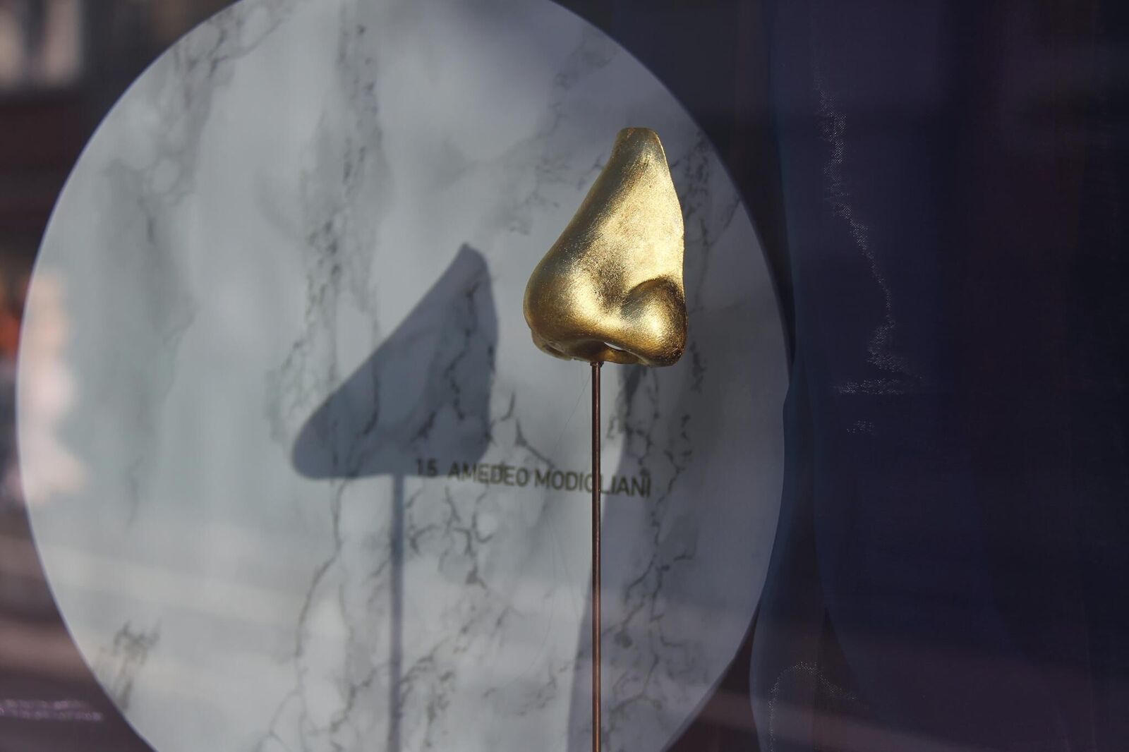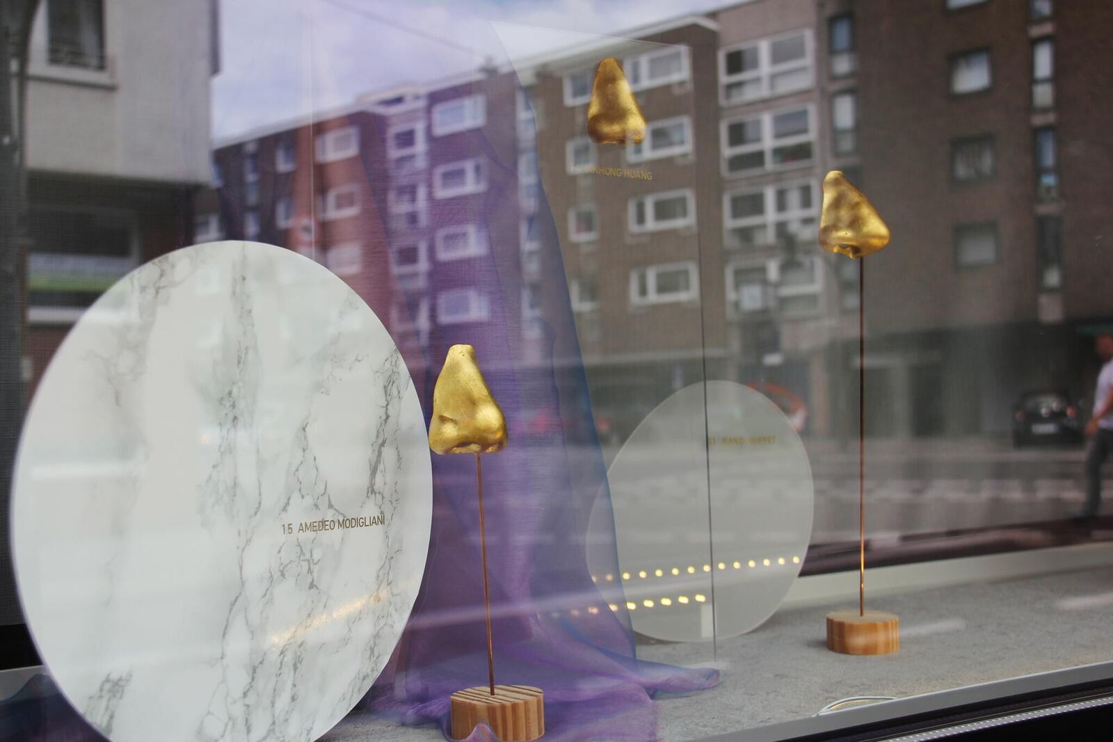Der Laden „Goldene Nasen“ ist ein Persiflage-Projekt, welches sich gegen den Aktionsumsatz als wichtigen Maßstab für den Wert eines Künstlers richtet. Dieser Name kommt von dem Sprichwort „sich eine goldene Nase verdienen“. Der Laden hat die Top 25 der weltweit erfolgreichsten Künstler ausgesucht (Artprice 2016). Die goldenen Nasen von diesen 25 Künstlern werden im Laden ausgestellt. Die Zuschauer im Laden werden sehr höflich behandelt wie in einem adligen Luxusladen. Sie können die goldenen Künstlernasen aussuchen und anprobieren. Aber es ist offensichtlich, dass sie in diesem Laden nicht die Kunstwerke der erfolgreichsten Künstler sehen, sondern nur die glänzenden Schäume.