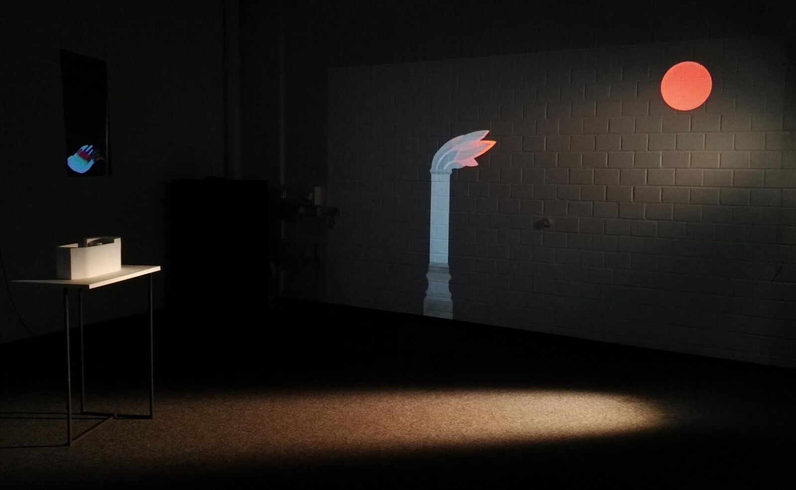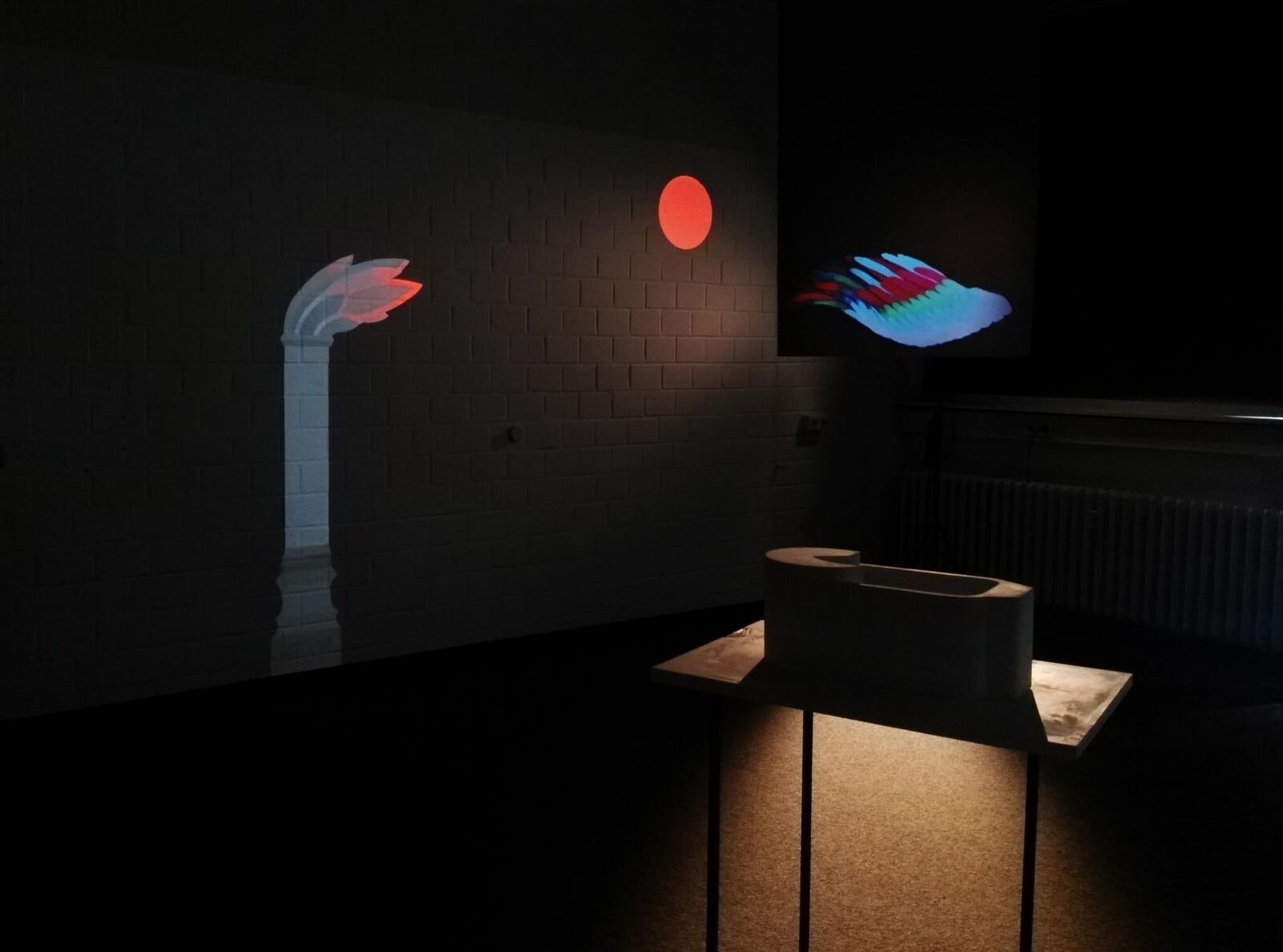 ""Echos disorder"" verwendet das architektonische Vokabular religiöser Gebäude. Weißes Objekt, das sich durch einfache Linien und Formen definiert, kombiniert mit Animationsprojektion, stellt moderne Architekturmodelle wie das Bauhaus mit Bildern in Verbindung, die in der Regel aus mittelalterlichen Gemälden oder alten östlichen Ruinenelementen stammen, sowie ornamentalen Motiven. Die Idee, das Architekturmodell zu verwenden, entstand in meiner letzten Einzelausstellung. Dort habe ich die zweidimensionalen Zeichnungen von Erwin Heerich in ein dreidimensionales Modell eines Schwimmbades verwandelt.
