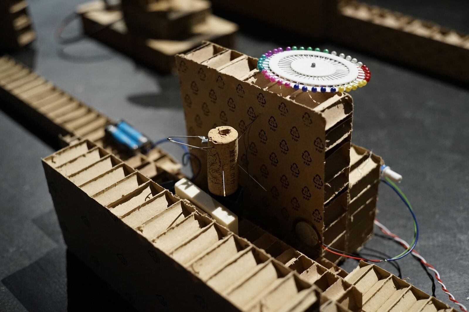Time-piece is based on a six-meter-long structure of honeycomb paperboard. Dried plants, a stone, needles, erasers, wine corks, a metallic brush and cable-ties are combined with electronic devices. Those small motorized objects make subtle sounds by touching the cardboard in their different ways. Each sonic movement slowly changes by time due to a gradual decline of batteries and gains a new rhythm after the power supply changes. This sounding dynamics are contrasted by the visual linearity. To arrange and combine the mundane with the electronic, especially using the batteries, is inspired by the film Le Bonheur(1965) which questions individual role and social function in terms of family dynamics, as Agnes Varda, a director of the film, mentioned, “Each of us is unique but replaceable. If a woman fulfills her functions as a wife, mother, cook, and gardener, the family does well. Every woman may discover her identity, her talent and her place but she is replaceable insofar as she fulfills her social function.”