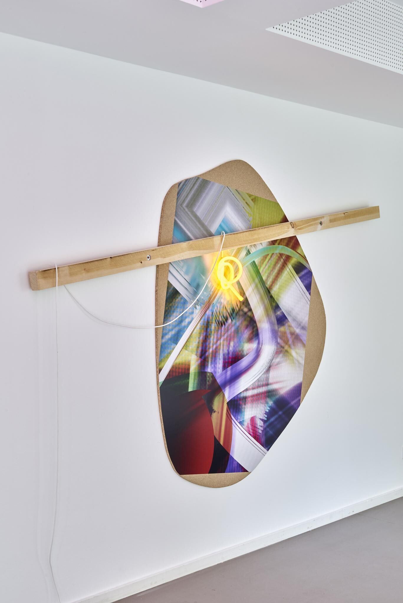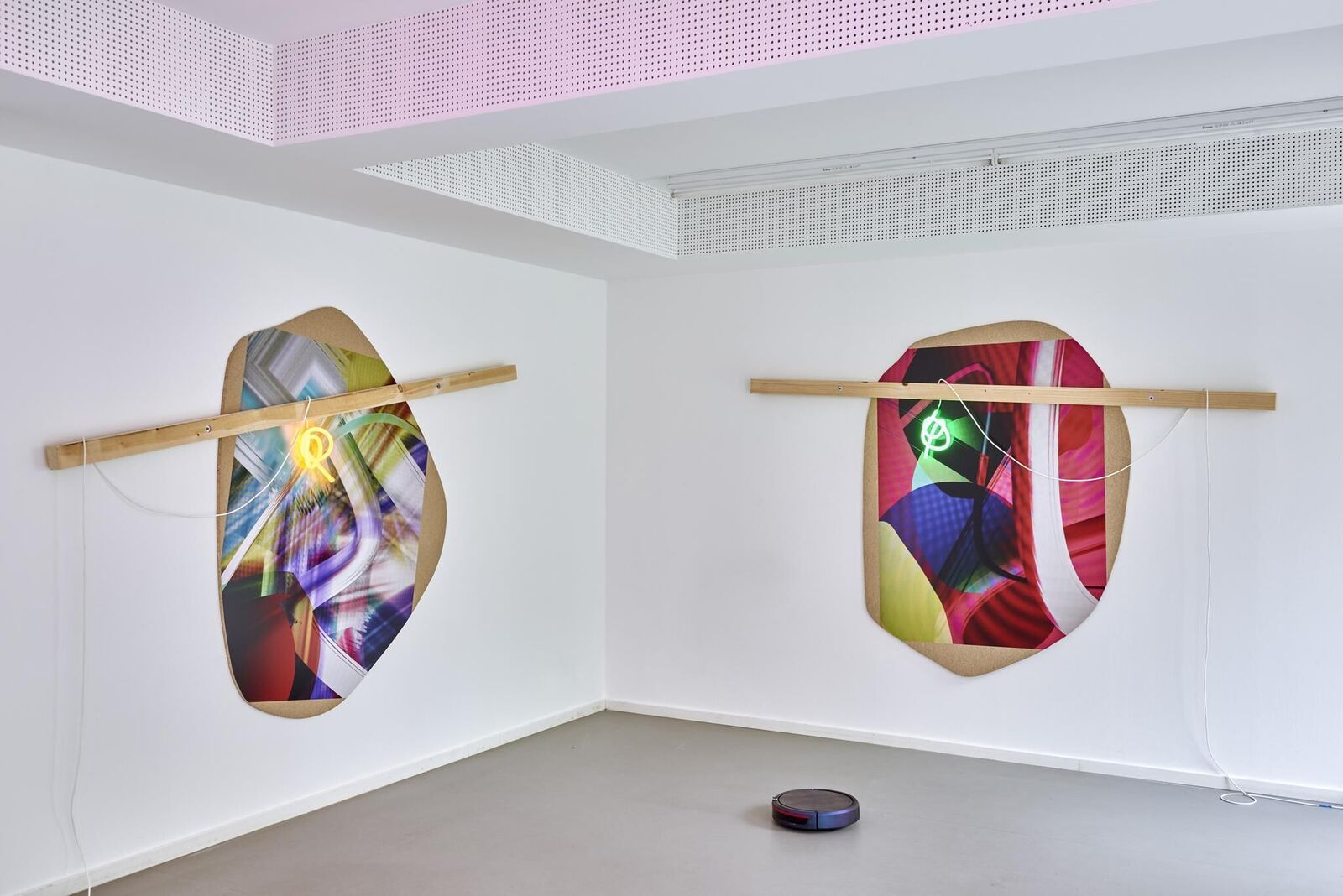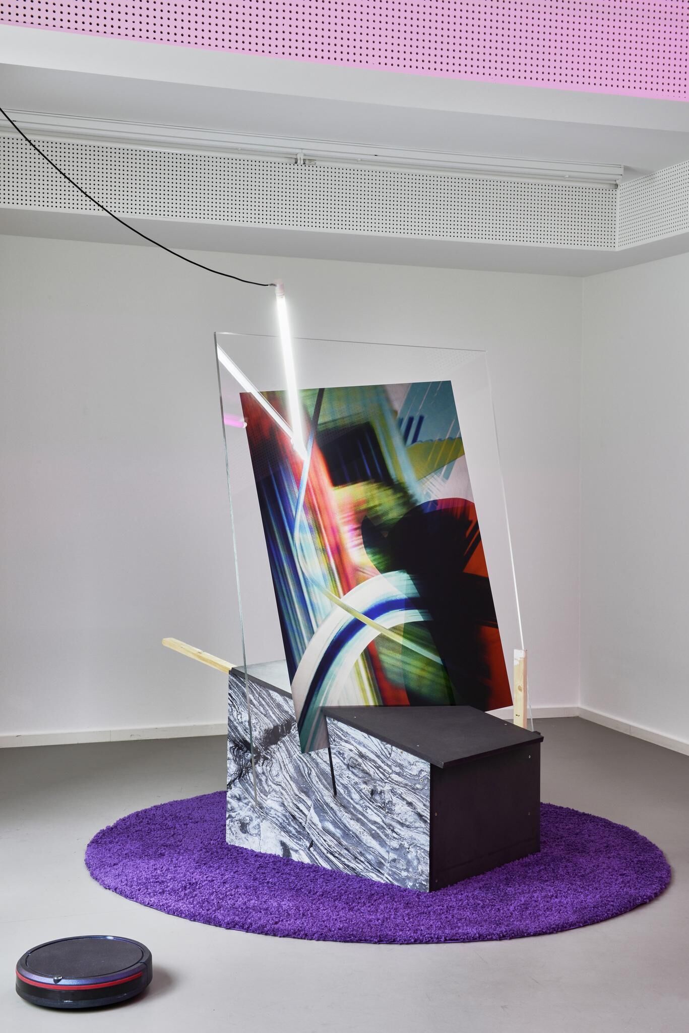 Bunt und verspielt, weich und hart, gestisch, konstruiert, programmiert und inszeniert In „Tangled Matter“ ist es ein transmedialer Prozess des Zusammen- und Übertragens, der zur digitalen Malerei, zum fotografischen Bild, zum Objet trouvé, zur Skulptur und Rauminstallation führt. diverse Materialien (Lambda Print, Acrylglas, Pressspan, MDF, LED-Leuchtmittel, Latten, Teppich, Vorhang, Staubsaugerroboter)
