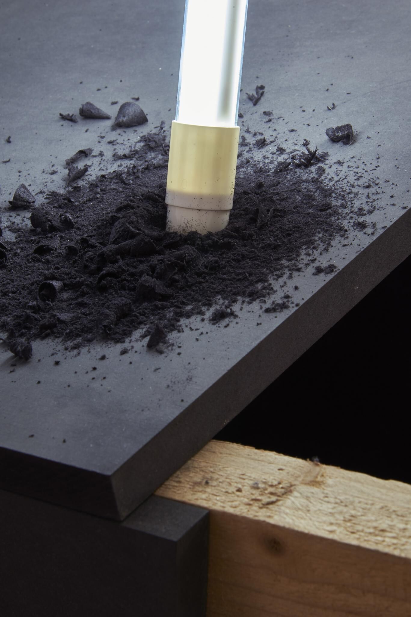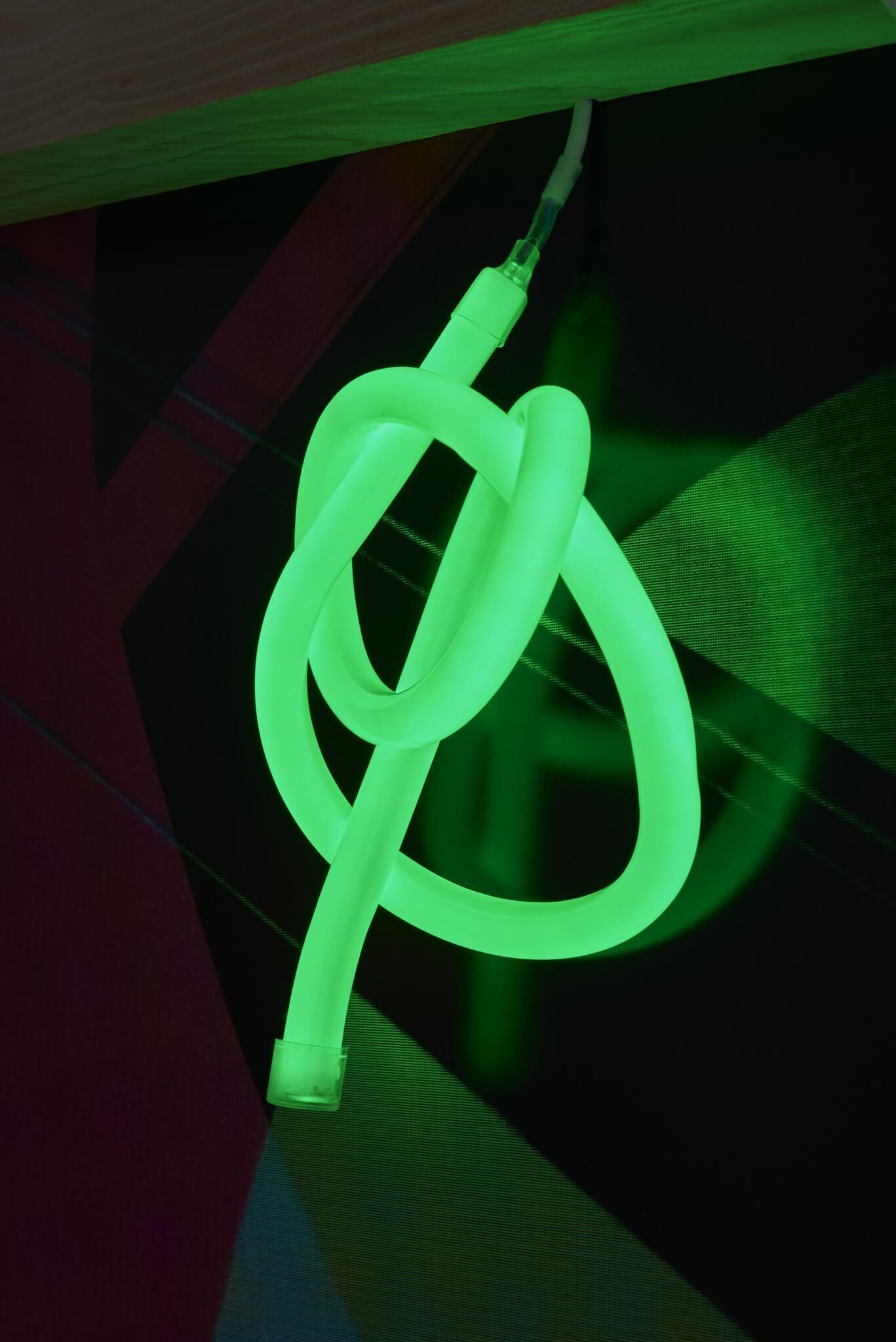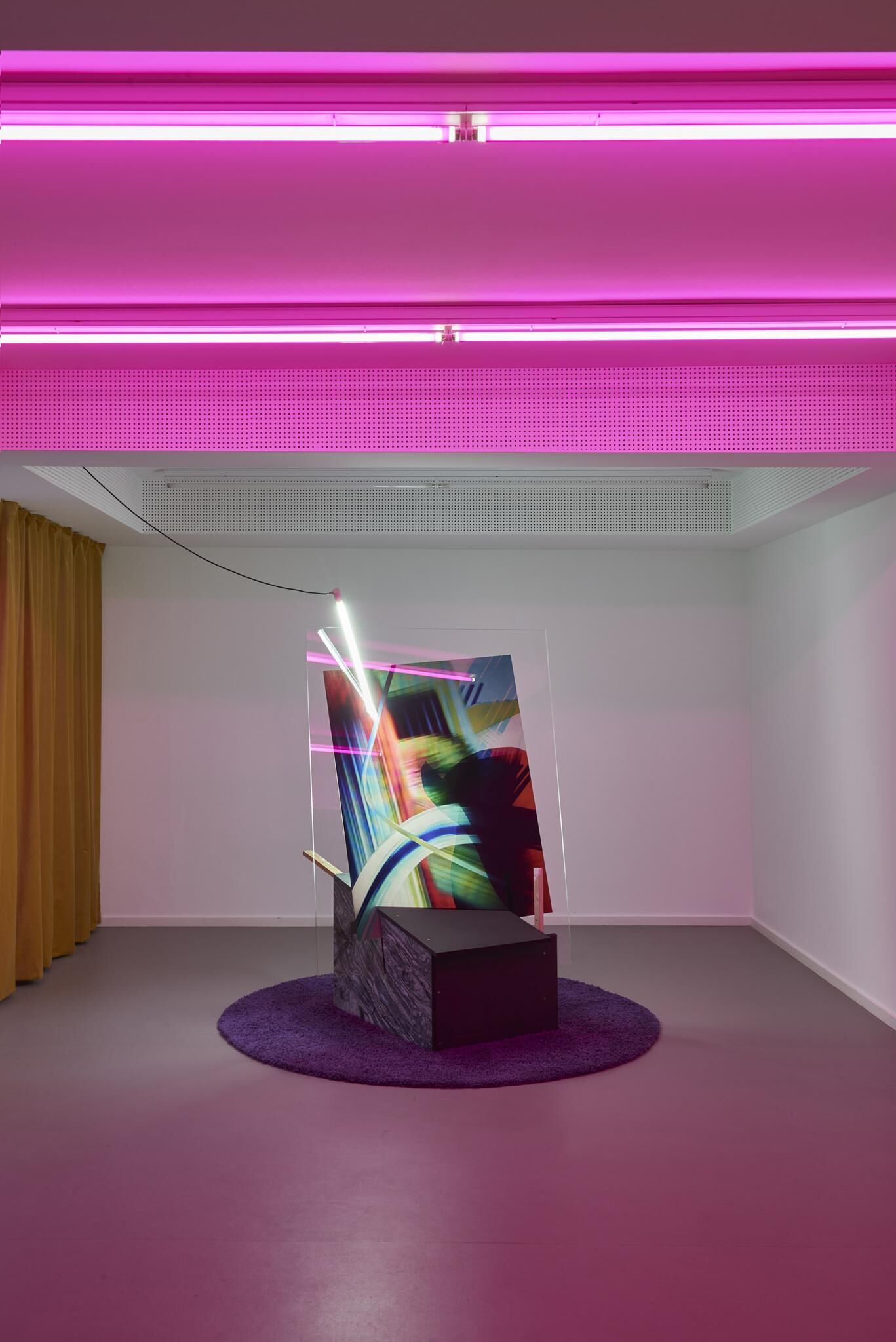 Bunt und verspielt, weich und hart, gestisch, konstruiert, programmiert und inszeniert In „Tangled Matter“ ist es ein transmedialer Prozess des Zusammen- und Übertragens, der zur digitalen Malerei, zum fotografischen Bild, zum Objet trouvé, zur Skulptur und Rauminstallation führt. diverse Materialien (Lambda Print, Acrylglas, Pressspan, MDF, LED-Leuchtmittel, Latten, Teppich, Vorhang, Staubsaugerroboter)
