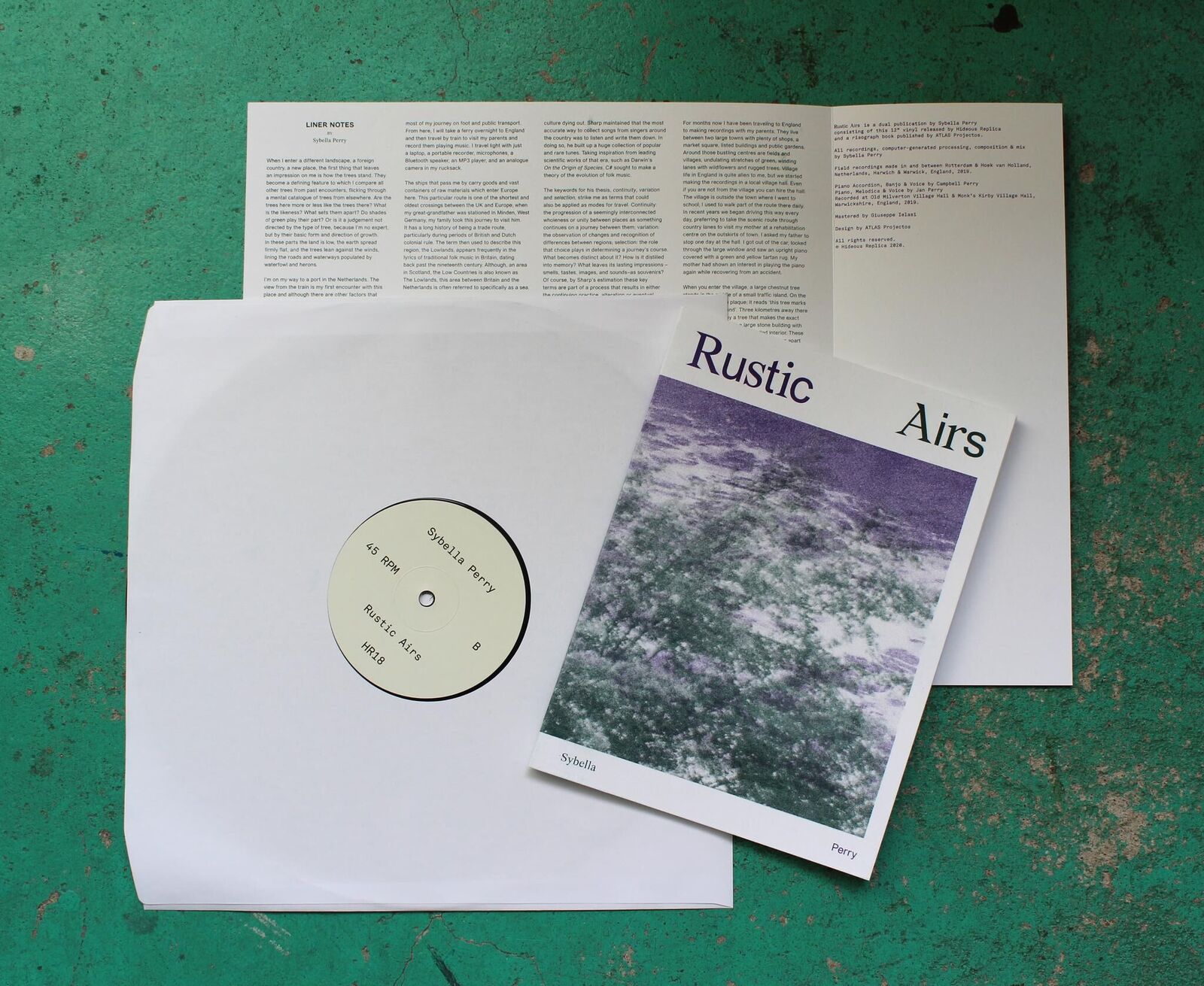In ihrer Doppelpublikation „Rustic Airs“, die ein Künstlerbuch und eine Schallplatte umfasst, nimmt Sybella Perry das Beispiel der englischen Airs – einfacher, austauschbarer Melodien von Volksliedern, die sich auf dem Weg ihrer Verbreitung durch Großbritannien stetig verändert haben – zum Anlass, um über Mobilität, Transformation und Pluralität nachzudenken. Perry verknüpft in ihrem künstlerischen Ansatz sowohl generative elektroakustische Kompositionen mit instrumentalen Folkrecordings als auch kritisches Schreiben mit Reiseberichten. Ihre Klangtexturen aus kurzen Notizen und langen Erzählpassagen lassen die Veränderung in den Freiräumen zwischen Menschen, Räumen, Orten, Wörtern, Klängen und Themen zum Vorschein kommen. Die LP erscheint bei Hideous Replica. Von Seite https://hideousreplica.co.uk/HR18: Rustic Airs is a dual publication by Sybella Perry consisting of a vinyl record released by Hideous Replica and a risograph book published by Atlas Projectos. All recordings, generative-processing, composition & mix by Sybella Perry. Field recordings made in and between Rotterdam & Hoek van Holland, Netherlands, Harwich & Warwick, England, 2019. Piano Accordion, Banjo & Voice by Campbell Perry. Piano, Melodica & Voice by Jan Perry. Recorded at Old Milverton Village Hall & Monk’s Kirby Village Hall, Warwickshire, England, 2019. Mastered by Giuseppe Ielasi.