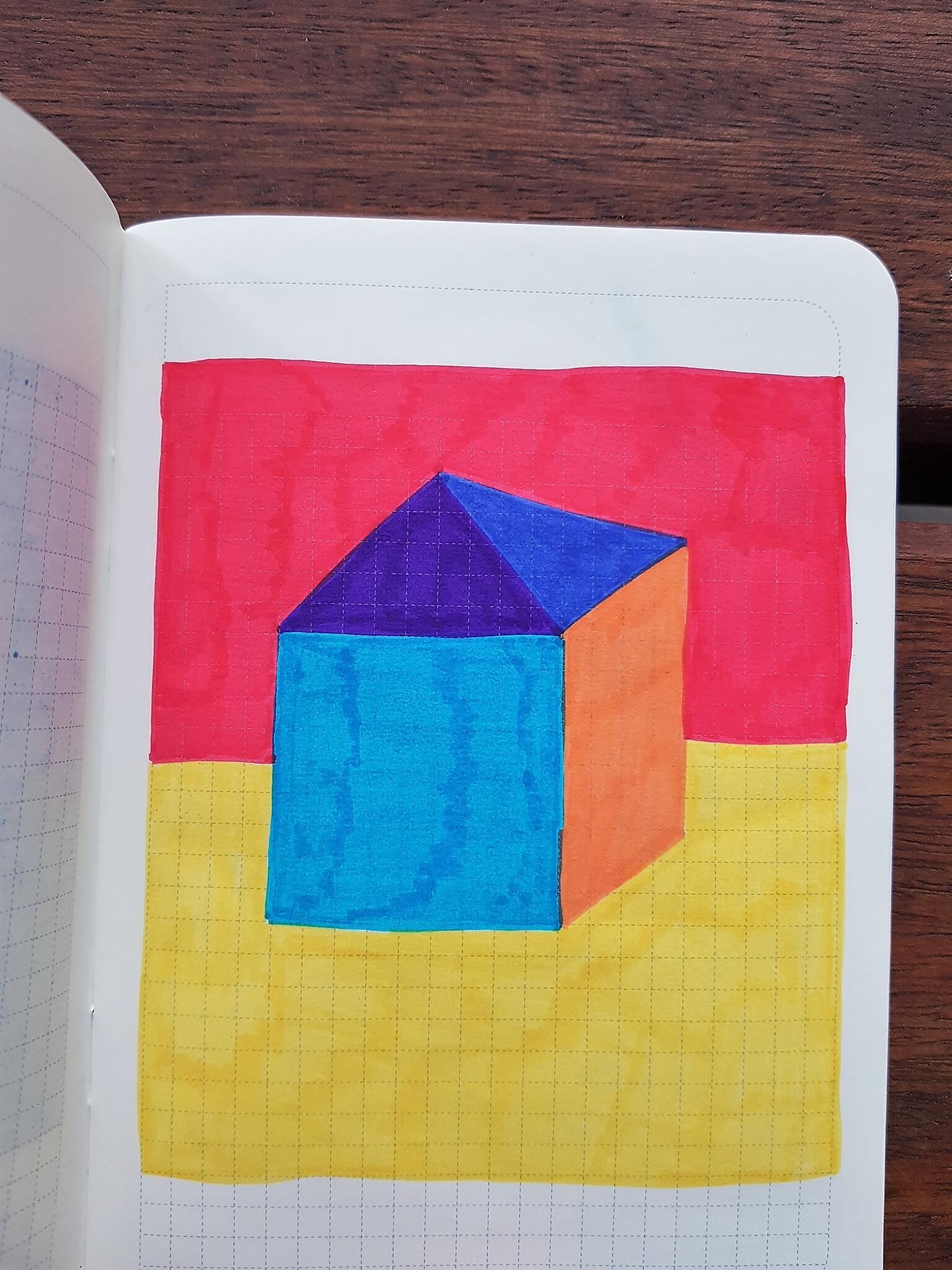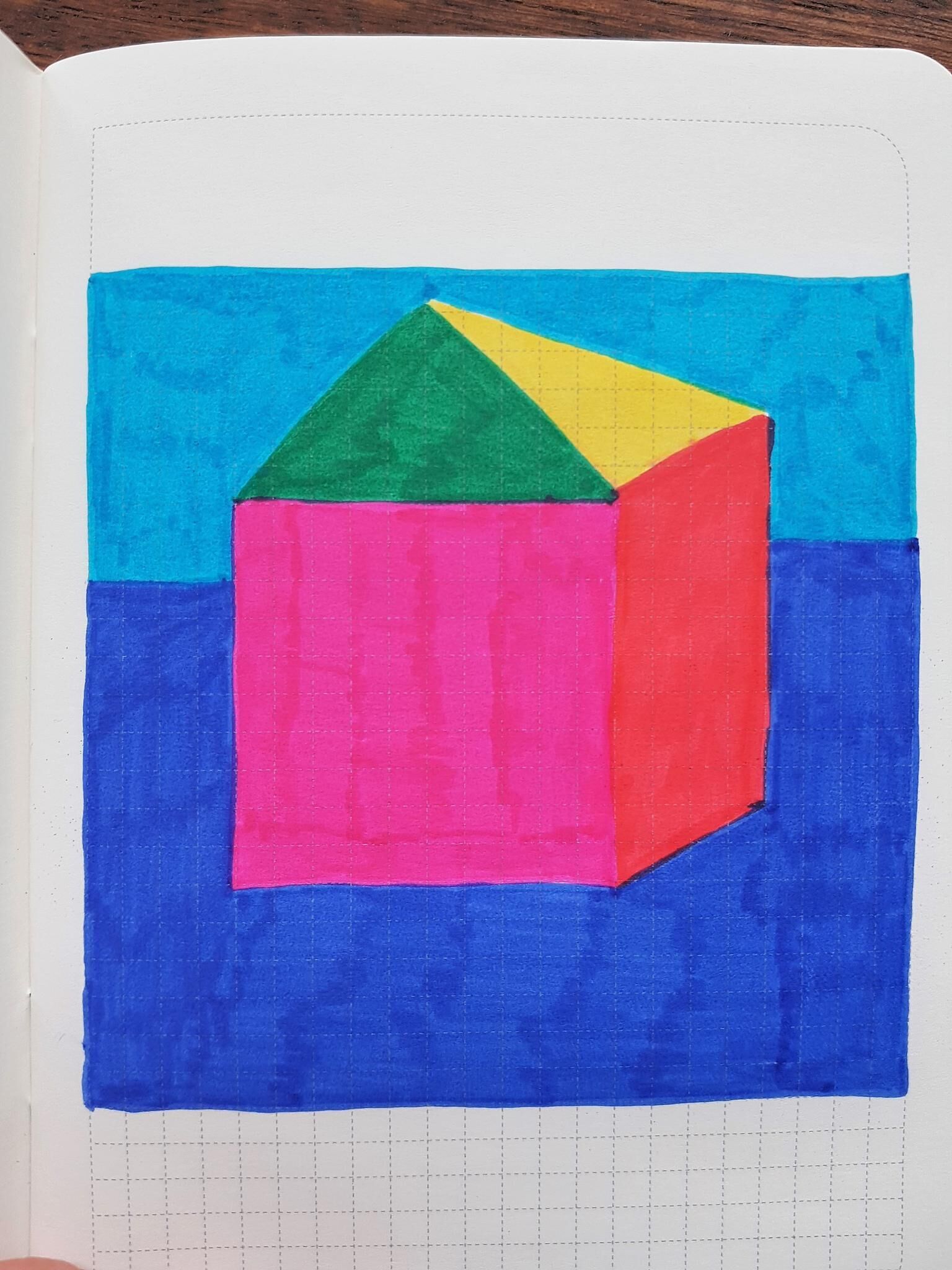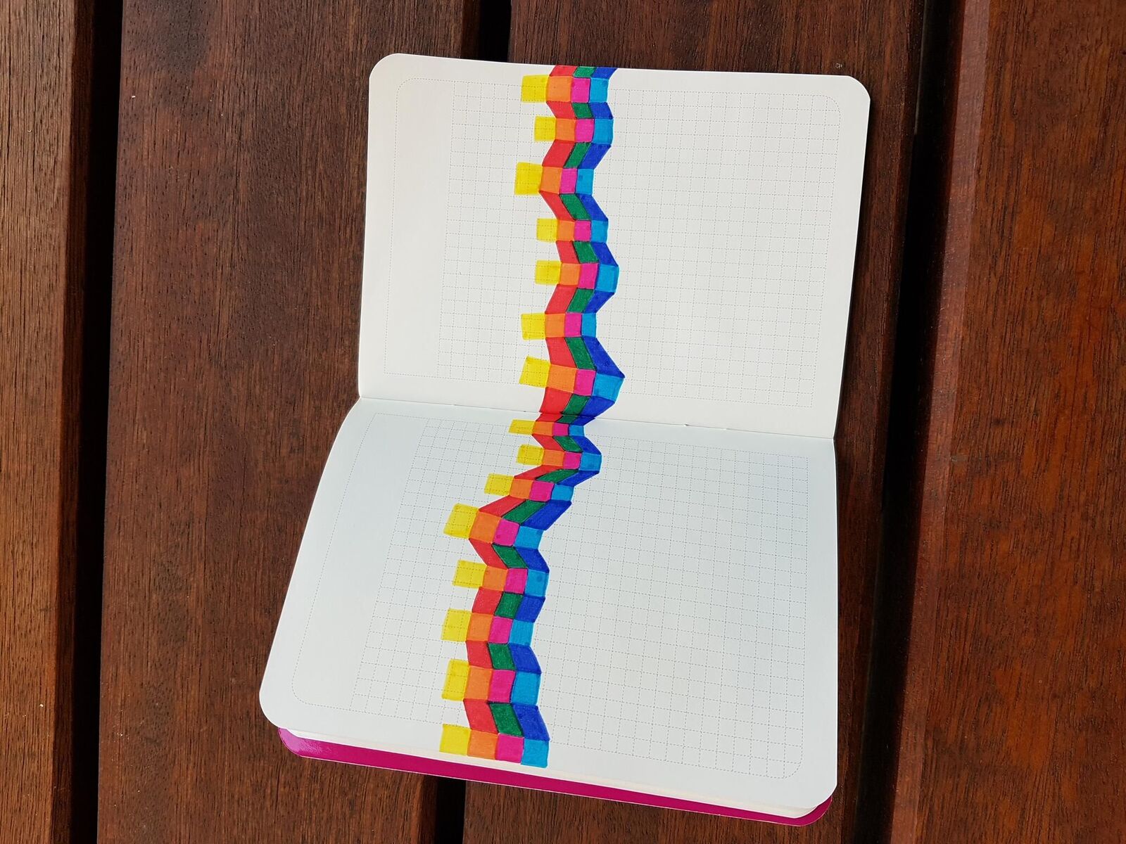 Im Format des Skizzenbuchs werden in „Hearing A Stranger Breathe“ u.a. Farben und Formen erkundet. Farbkombinationen und -kompositionen, aber auch tägliche (Wort-)Skizzen, Gedanken sowie kleinteilige Zeichnungen, die sich in einem eher grafischen Bereich bewegen, füllen die Seiten des Skizzenbuchs. Hier ist auch interessant, wie die unterschiedlichen, verwendeten Stifte, mit der Oberfläche des glatten Papiers reagieren - die genaue Beschaffenheit des (Träger-)Mediums und die damit verbundenen Spielräume werden in einem regelmäßigen, meist täglichen, Rhythmus erforscht.