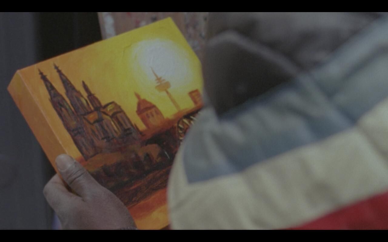Dokumentiert wird die Entstehung eines Bildes: das Bild des Köner Doms, das Augusto Kutxi-Bungo seit ungefähr vier Jahren tausendfach gemalt hat. Die manuelle Reproduktion eines massenmedialen Motivs in Zeiten des Spätkapitalimus.