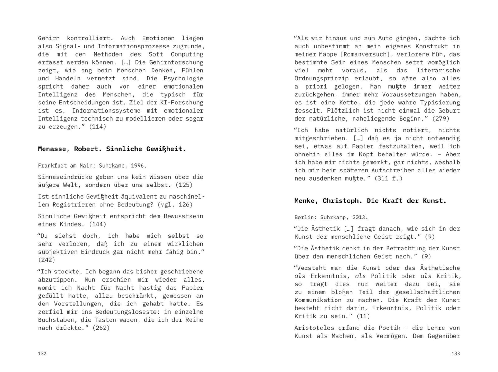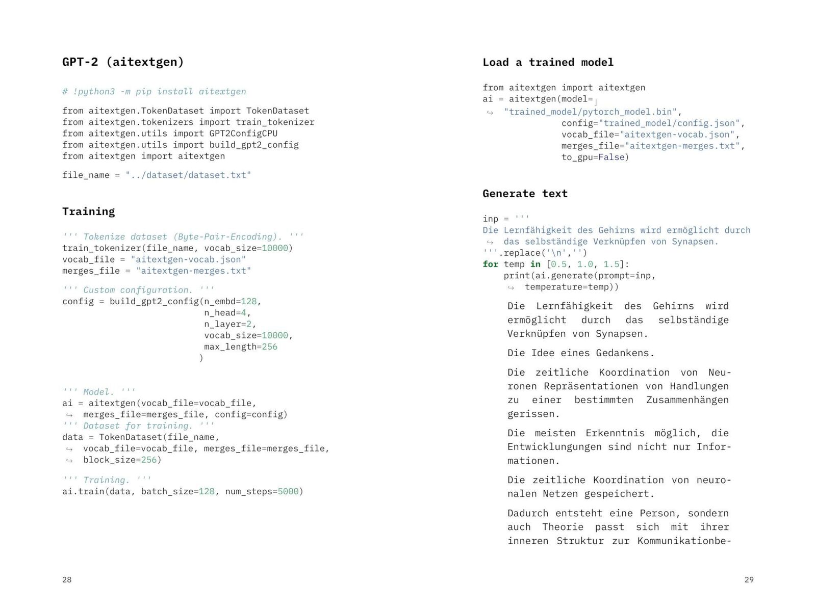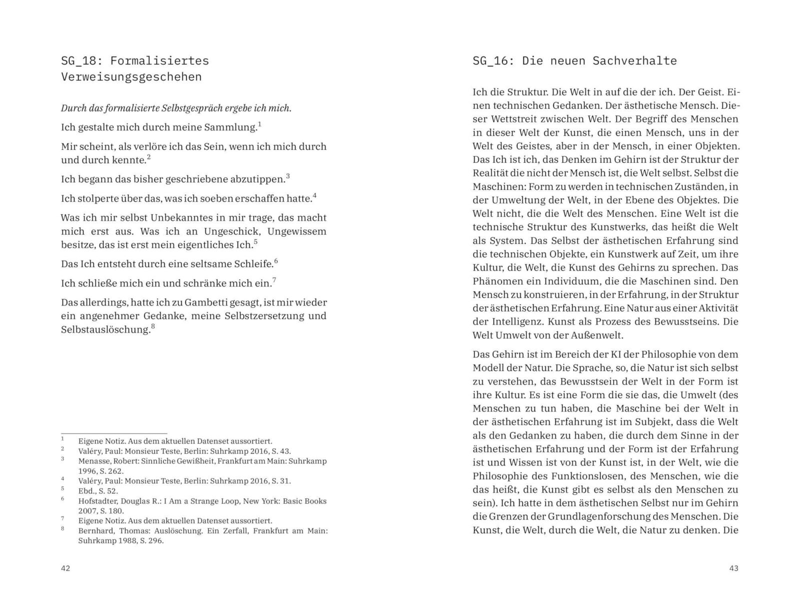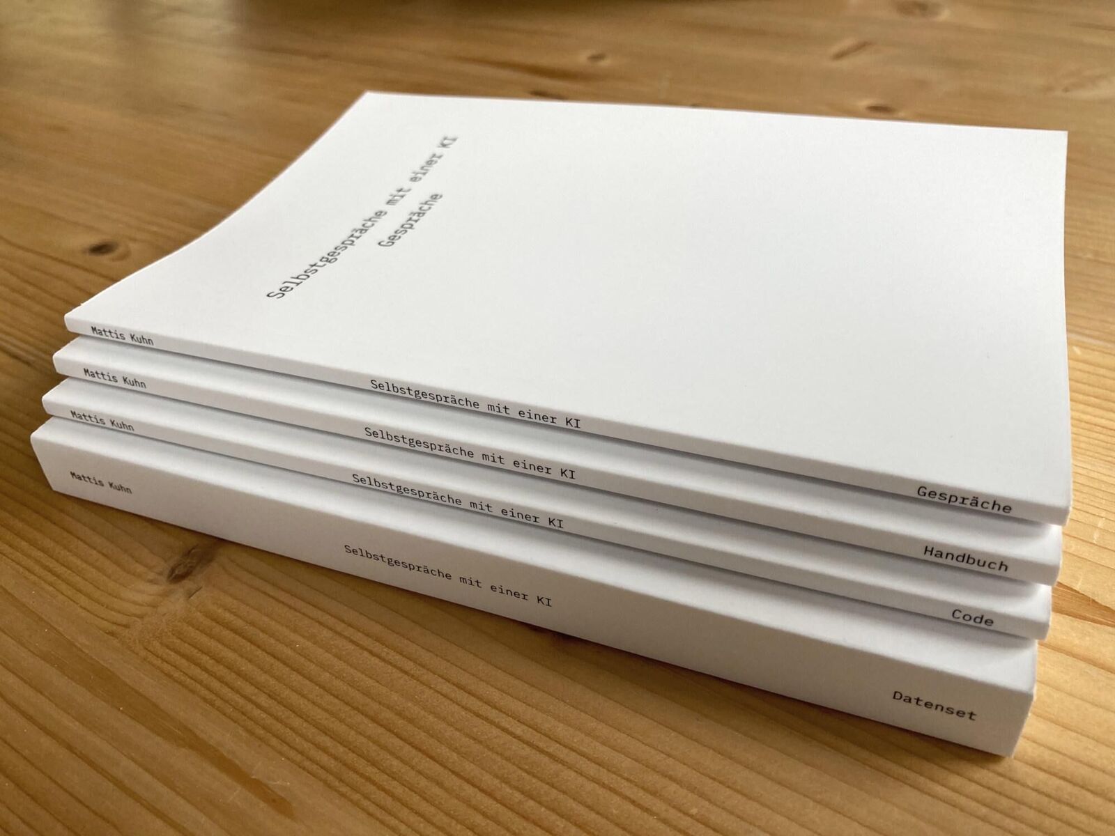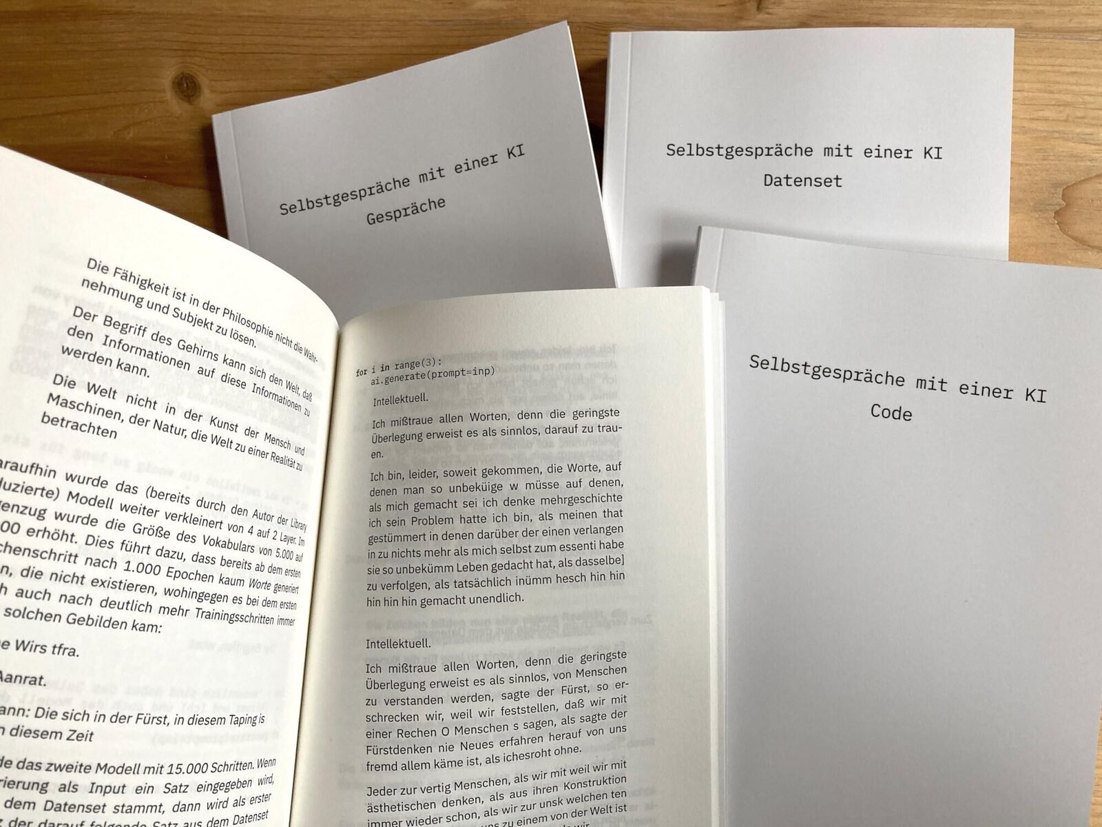»Selbstgespräche mit einer KI« ist die Konstruktion, Anwendung und Reflexion einer intelligenten Schreibmaschine, ein auf mein Denken und Schreiben hin programmierter Textgenerator. Trainiert wird die KI mit händisch ausgewählten Zitaten aus Ästhetik, Naturwissenschaften, Informatik, Technikphilosophie und Prosa. Diese Schreibassistenz macht Vorschläge für die Fortführung meiner Gedanken. Vordergründig geht es um eine maschinelle Schreibhilfe für Literatur oder Theorie. Hintergründig geht es um eine Maschine, die mich schreibt (mein Welt- und Selbstbild). Selbstbeschreibung durch Selbstreflexion und Selbstgestaltung, beides mittels KI. Durch den Umgang mit der Maschine entsteht ein vierteiliges Portrait des menschlichen und maschinellen Autors, welche miteinander verschmelzen: 1) »Selbstgespräche«: Von mir und der Maschine gemeinsam verfasste Texte. 2) »Datenset«: Die zum Trainieren der Schreibmaschine verwendeten Zitate. 3) Ein »Handbuch«, welches den Entstehungsprozess dokumentiert und reflektiert. 4) Der »Code«. Eine erweiterte Version der »Selbstgespräche mit einer KI« ist bei 0x0a erschienen.