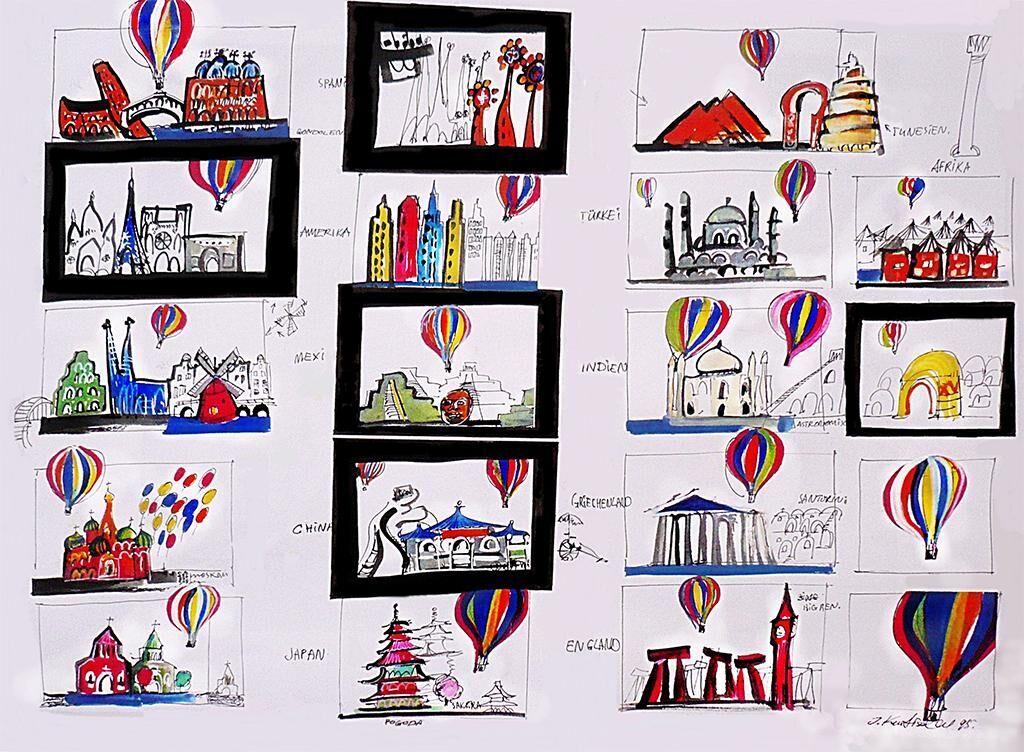 Ein animierter Trailer/Vorspann für ein Kinderprogramm.Die Kinder reisen mit dem Ballon um die Welt, vor ihren Augen tauchen Länder und Städte auf. Die Welt ist ein großes einheitliches Land und darin besteht ihre Schönheit… Das Kindermagazin bot einen breiten Überblick über Kunst und Kultur auf internationaler Ebene und wurde für ein internationales Kinderpublikum gedacht. Dieses sollte auf die Kinder wie ein großes, umfangreiches Spiel wirken, das die kindlichen Phantasien, Träume und Erlebnisse binden konnte. Die Imitation der Reise sollte im Studio mit Hilfe von Modellen, Projektionen und durch den Einsatz neuer Medientechnologien hergestellt werden. Das Ergebnis bot den Kindern einen „multi-sinnlichen“ Zugang zu dem jeweiligen Phantasie-Land. Das INTRO stellte ein buntes Panorama verschiedener kulturell wichtiger Baudenkmäler dar, wobei der Ballon und das streifzugartige Vorbeiziehen an Gebäuden ein immer wiederkehrendes Motiv wurde.