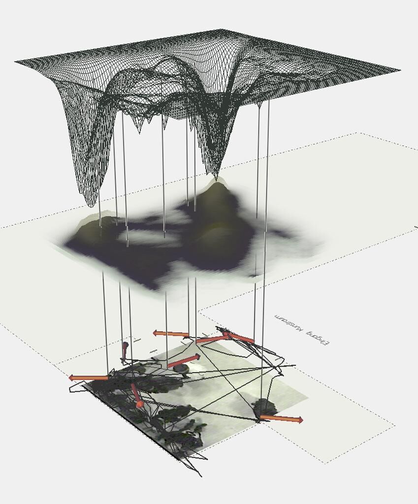 Die Installation errechnet aus den Bewegungen von Menschen die Statistik der Frequentation einen öffentlichen Platzes. Ein Netz erzeugt Berge, wo Menschen sich häufig treffen und Täler für Orte, die gemieden werden. Es geht um das Bewegungsverhalten von Menschen im Raum und ihren Interaktionen bei spontanen Begegnungen. Die Installation hinterfragt geometrische Raumverhältnisse (Territorien, Distanzverhalten), wie sie durch Konzentration von Menschen auf Plätzen erzeugt werden und macht diese visuell und akustisch wahrnehmbar. Über einem öffentlichen Platz oder einer Halle wird eine Kamera installiert. Diese Kamera erfasst die Bewegungsspuren der Menschen, welche als Linie in das Bild geschrieben werden und somit Information über die Inanspruchnahme des vorgegebenen Ortes liefern. Über dieser Struktur bildet sich ein Liniengeflecht, das die aktuellen Aufenthaltsorte der Menschen als Territorien (Kreise) anzeigt und Nachbarn grafisch miteinander verbindet. Wann bilden sich Gruppen? Wer nimmt in seinem Verhalten auf andere Personen Bezug? Sind in diesen Strukturen Regeln erkennbar? Geometrische Interpretationen hinterfragen das Abstandverhalten der Leute auf Proportionen hin (beispielsweise den goldenen Schnitt) und setzt entstehende lokale Geometrien miteinander so in Verbindung, dass ein globales, den Ort überspannendes Netz von Mustern entsteht, das als Zusammenfassung der Einzelereignisse verstanden werden kann. Diese Muster werden als Klänge hörbar gemacht und werfen die Frage auf, ob in unserem Verhalten im Raum? Harmonische? Verhältnisse (im Sinne der althergebrachten Proportionenlehre) einen besonderen Stellenwert haben. Die Passanten haben somit die Möglichkeit, mit dem Videobild zu spielen und – in Abhängigkeit von ihrem Verhalten – Klänge und Geometrien zu erzeugen. In einem zweiten Bild wird aus den Spuren der Menschen der vergangenen Stunden eine virtuelle Landschaft errechnet, in welcher die Häufigkeiten der Frequentation eines Ortes Berge erzeugen, und Täler die gemiedenen Orte darstellen. Diese virtuelle Landschaft wird (in Zukunft) Abbild möglicher Architektur und hinterfragt als Resultat von menschlichem Territorialverhalten die Struktur der Stadt und das Bild der Stadtpläne und entwirft Möglichkeiten der Stadtplanung.